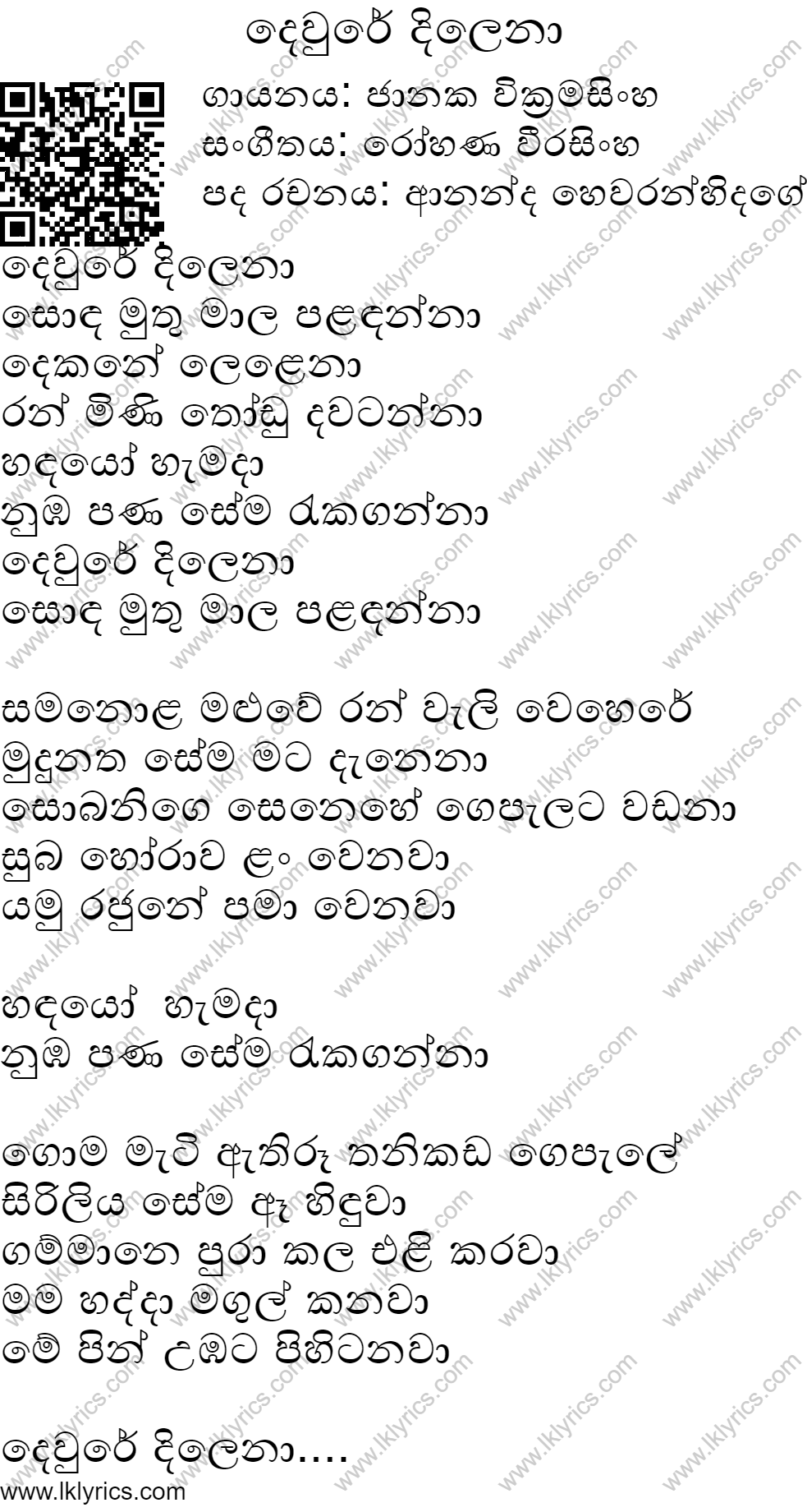 Our records indicate that Devre Dilena is sung by Janaka Wickramasinghe, . The lyricist of this song is Ananda Hewaranhidage. The composer of this song is Rohana Weerasinghe. Devre Dilena's first published year is unknown. We would like to invite you to submit it if you are aware. You can listen to this song by visiting the following youtube link: https://www.youtube.com/watch?v=BIbkpbLVuzs&list=RDBIbkpbLVuzs&start_radio=1. Lk Lyrics is largely a community maintained application. Please feel free to use our android app or web site to submit corrections to this song.