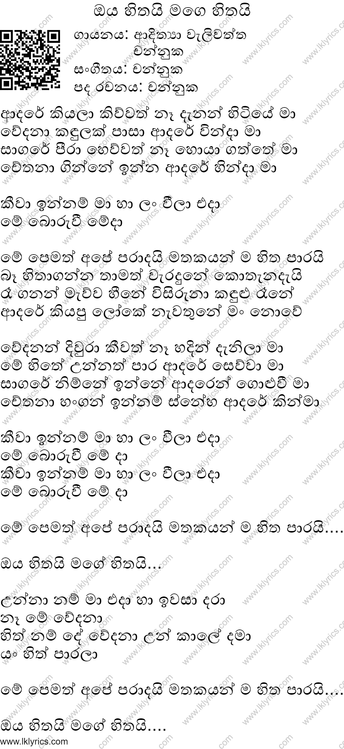 Oya Hithai Mage Hithai on LK Lyrics falls under and fully comply with 17 U.S.C. * 512 and the Digital Millennium Copyright Act (DMCA). As the Lk Lyrics team, we believe content ownership and intellectual property. If you're the copyright owner of this song and you wish to take this lyric material removed, you can do so by officially submitting a take down notice with the information on this page to info@lklyrics.com. However, we would like to stress that Oya Hithai Mage Hithai is displayed for informational purposes and Lk Lyrics is in no way claiming rights to this song.