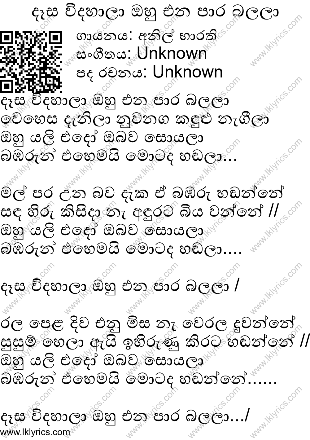 Dasa Widala Ohu Ena Paara Balala on LK Lyrics falls under and fully comply with 17 U.S.C. * 512 and the Digital Millennium Copyright Act (DMCA). As the Lk Lyrics team, we believe content ownership and intellectual property. If you're the copyright owner of this song and you wish to take this lyric material removed, you can do so by officially submitting a take down notice with the information on this page to info@lklyrics.com. However, we would like to stress that Dasa Widala Ohu Ena Paara Balala is displayed for informational purposes and Lk Lyrics is in no way claiming rights to this song.