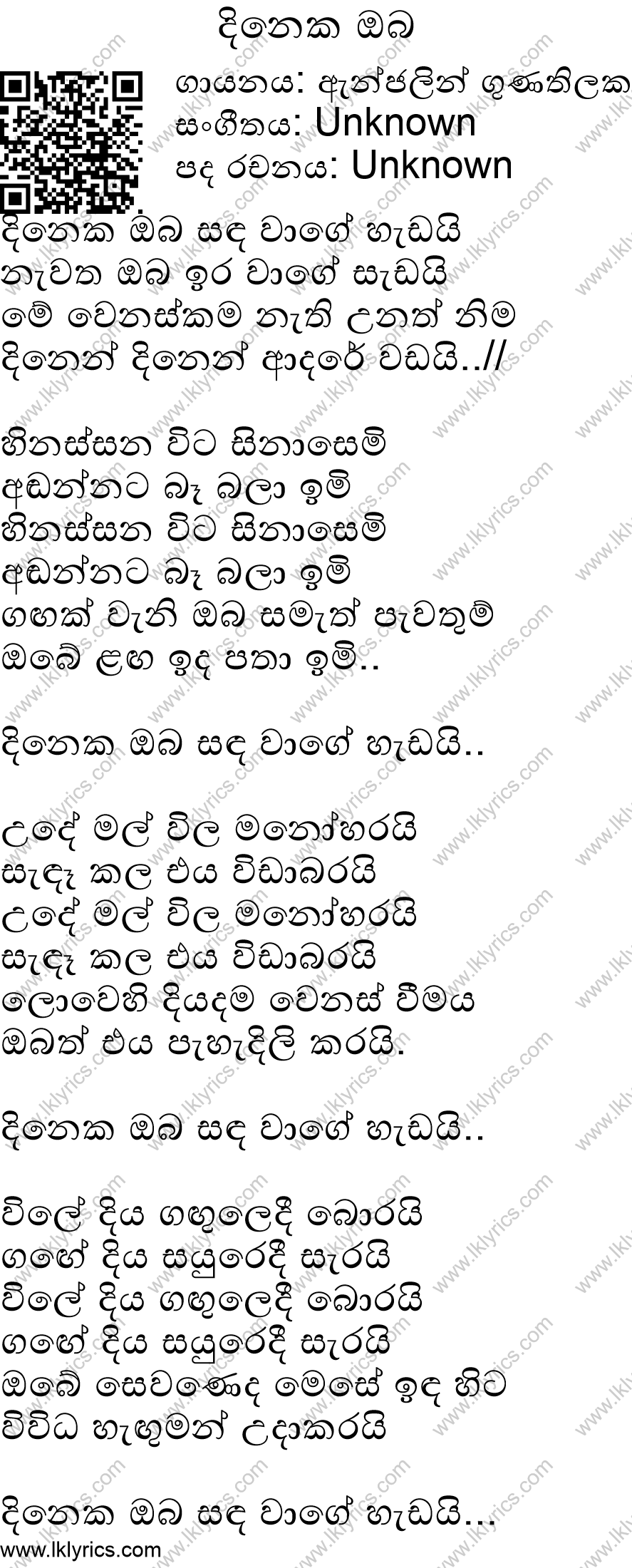 Our records indicate that Dineka Oba is sung by Anjalin Gunathilaka, . The lyricist of this song is currently unknown. The composer of this song is currently unknown. Dineka Oba's first published year is unknown. We would like to invite you to submit it if you are aware. We currently do not have a youtube link to this song. We appreciate if you can submit one. Lk Lyrics is largely a community maintained application. Please feel free to use our android app or web site to submit corrections to this song.