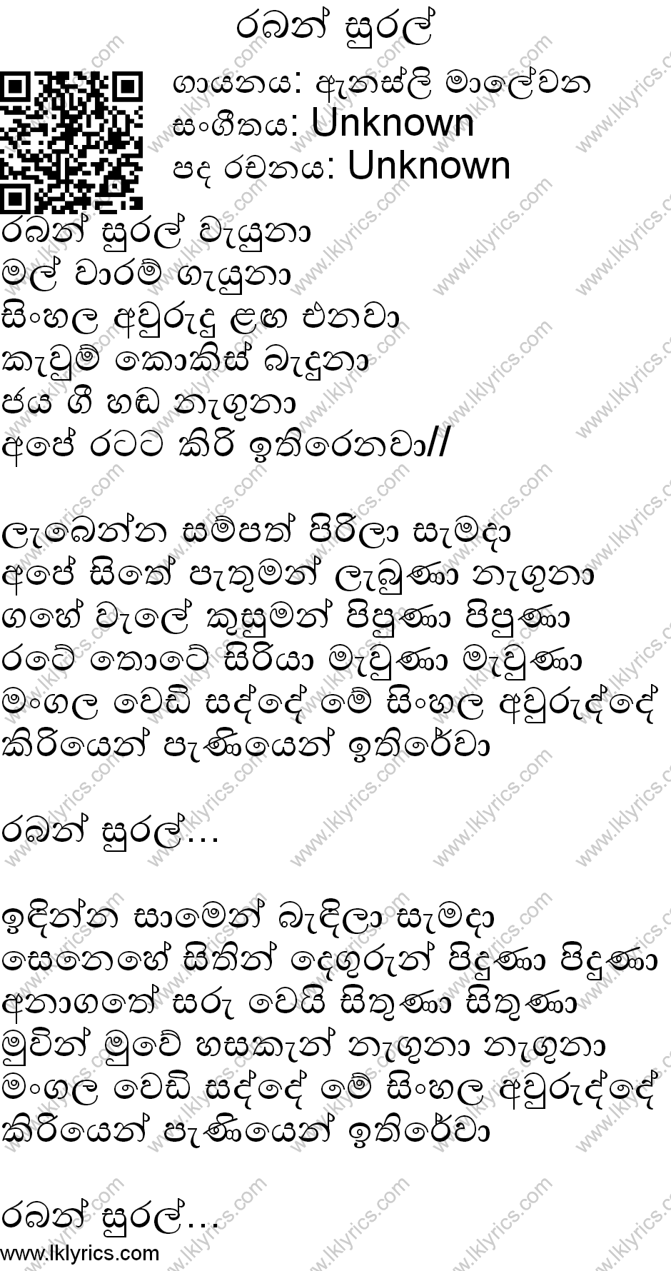 Our records indicate that Raban Sural is sung by Annesly Malewana, . The lyricist of this song is currently unknown. The composer of this song is currently unknown. Raban Sural's first published year is unknown. We would like to invite you to submit it if you are aware. You can listen to this song by visiting the following youtube link: https://www.youtube.com/watch?v=jyKNSyx9zlo. Lk Lyrics is largely a community maintained application. Please feel free to use our android app or web site to submit corrections to this song.