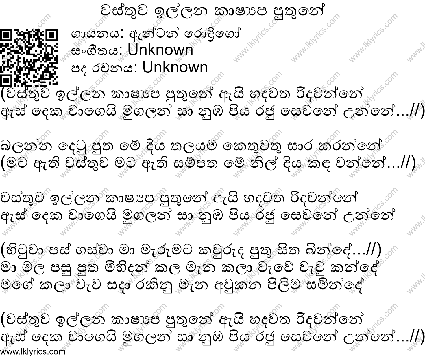 Wasthuwa Illana Kashyapa Puthune on LK Lyrics falls under and fully comply with 17 U.S.C. * 512 and the Digital Millennium Copyright Act (DMCA). As the Lk Lyrics team, we believe content ownership and intellectual property. If you're the copyright owner of this song and you wish to take this lyric material removed, you can do so by officially submitting a take down notice with the information on this page to info@lklyrics.com. However, we would like to stress that Wasthuwa Illana Kashyapa Puthune is displayed for informational purposes and Lk Lyrics is in no way claiming rights to this song.