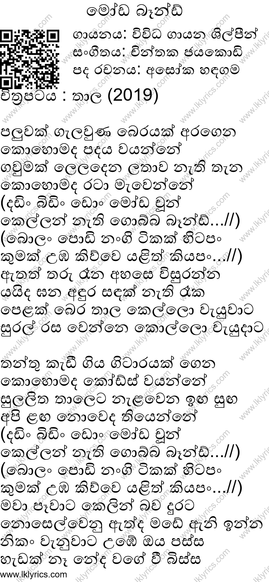 Our records indicate that Moda Band is sung by Various Artists, . The lyricist of this song is Asoka Handagama. The composer of this song is Chinthaka Jayakody. Moda Band's first published year is unknown. We would like to invite you to submit it if you are aware. You can listen to this song by visiting the following youtube link: https://www.youtube.com/watch?v=7NIefNKfVvw. Lk Lyrics is largely a community maintained application. Please feel free to use our android app or web site to submit corrections to this song.