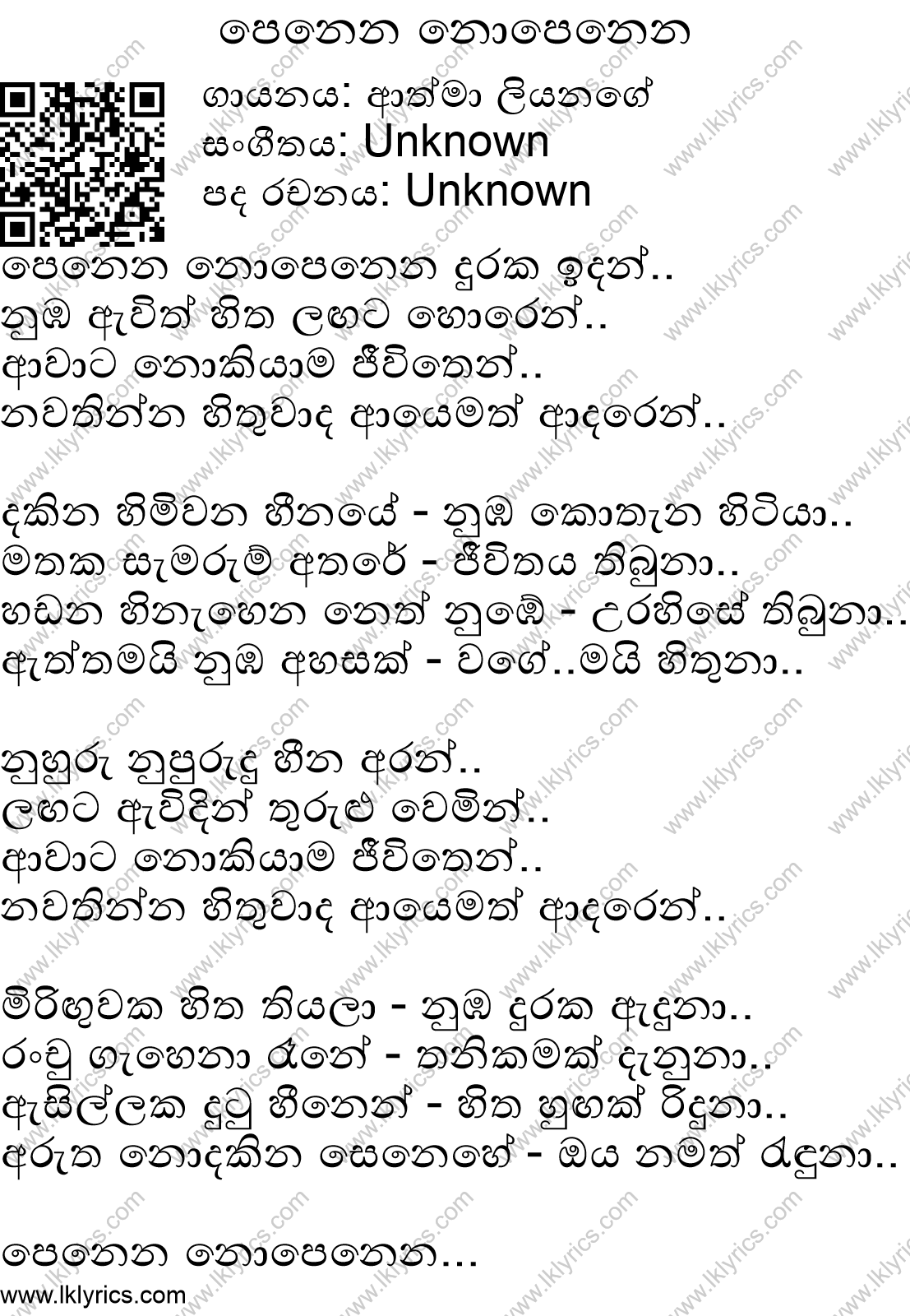 Our records indicate that Penena Nopenena is sung by Athma Liyanage, . The lyricist of this song is currently unknown. The composer of this song is currently unknown. Penena Nopenena's first published year is unknown. We would like to invite you to submit it if you are aware. We currently do not have a youtube link to this song. We appreciate if you can submit one. Lk Lyrics is largely a community maintained application. Please feel free to use our android app or web site to submit corrections to this song.