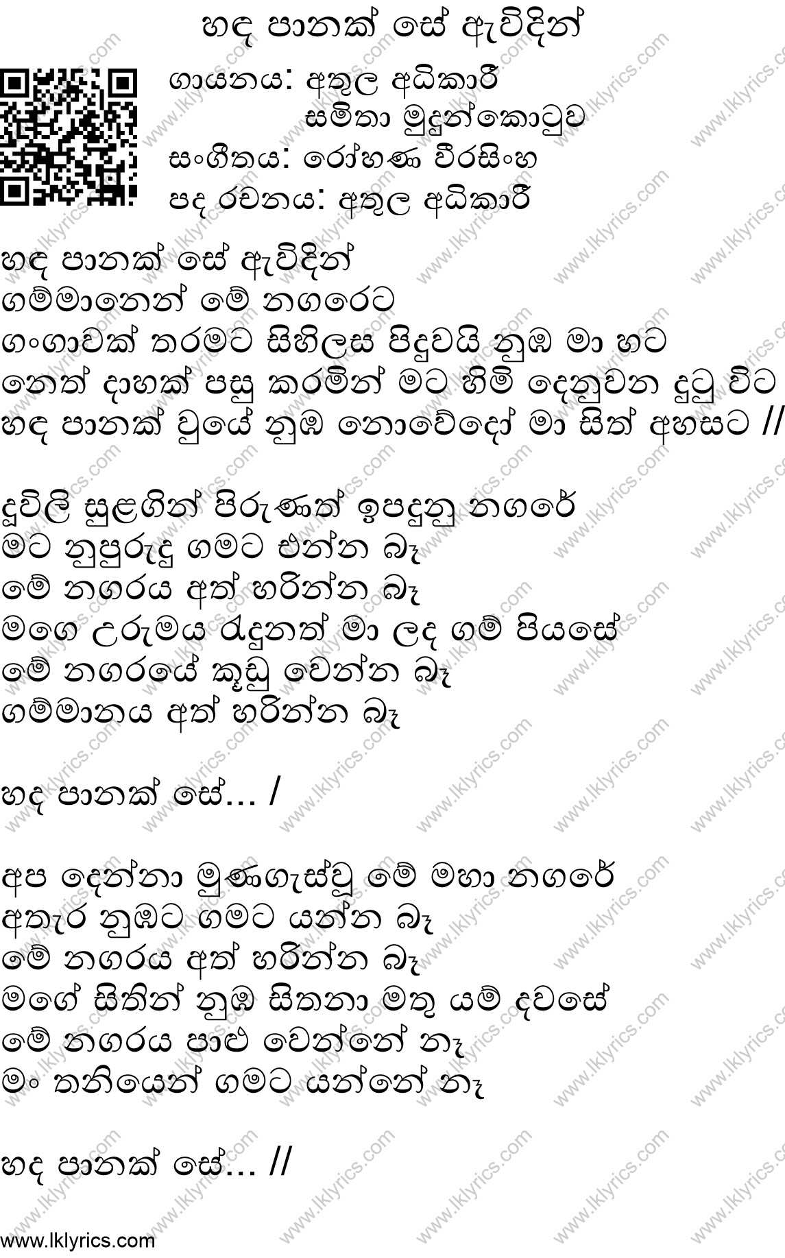 Our records indicate that Hada Panak Se Awidin is sung by Athula Adikari, Samitha Mudunkotuwa, . The lyricist of this song is Athula Adikari. The composer of this song is Rohana Weerasinghe. Hada Panak Se Awidin was first published in 2009. You can listen to this song by visiting the following youtube link: https://www.youtube.com/watch?v=10ZB5wq9ZM8. Lk Lyrics is largely a community maintained application. Please feel free to use our android app or web site to submit corrections to this song.