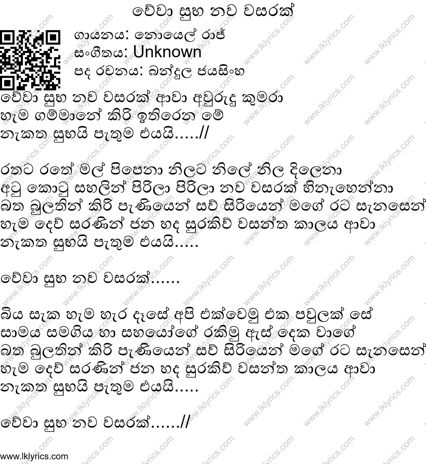 Our records indicate that Wewa Suba Nawa Wasarak is sung by Noel Raj, . The lyricist of this song is Bandula Jayasinghe. The composer of this song is currently unknown. Wewa Suba Nawa Wasarak's first published year is unknown. We would like to invite you to submit it if you are aware. We currently do not have a youtube link to this song. We appreciate if you can submit one. Lk Lyrics is largely a community maintained application. Please feel free to use our android app or web site to submit corrections to this song.