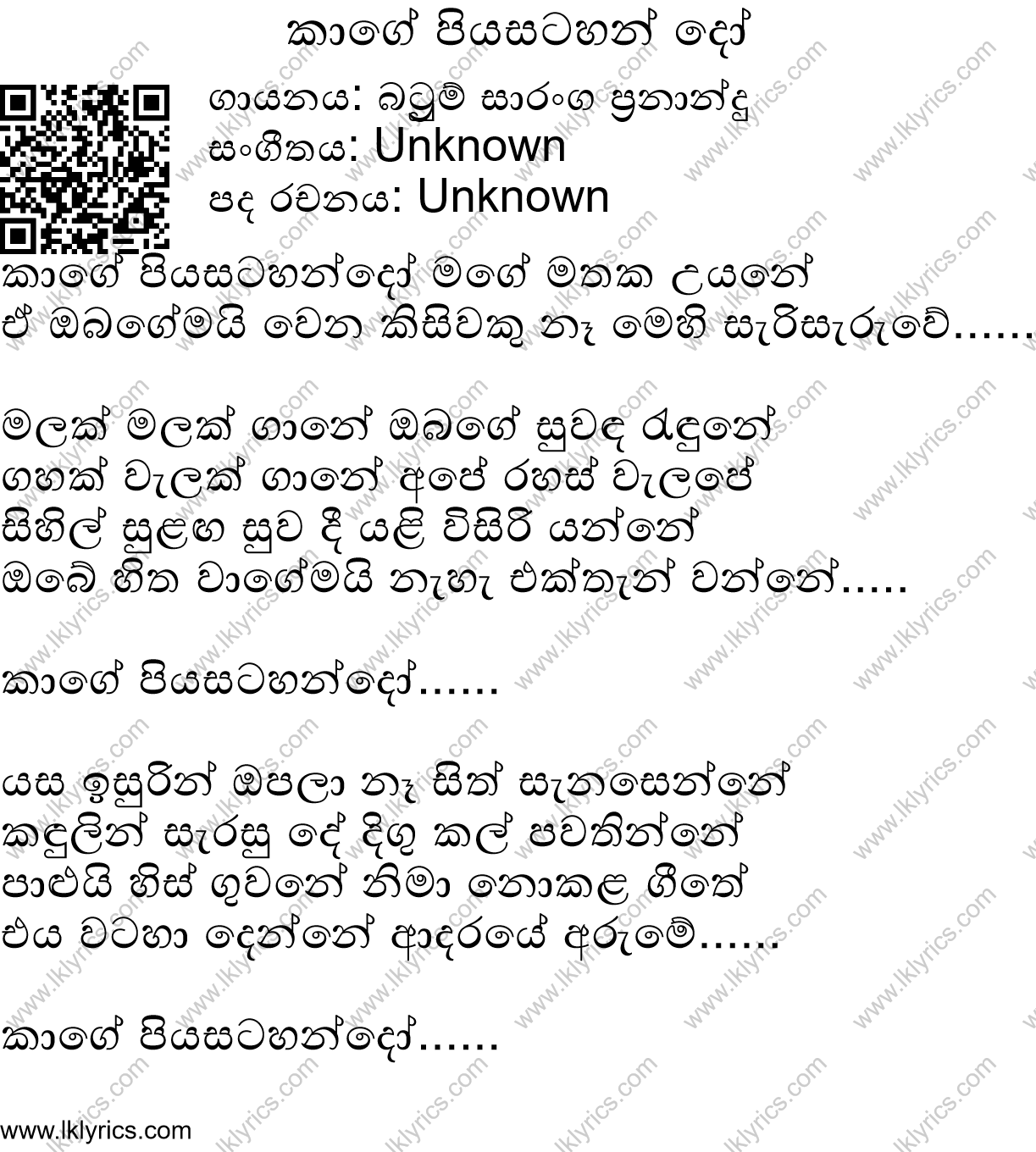 Kaage Piya Satahan Do on LK Lyrics falls under and fully comply with 17 U.S.C. * 512 and the Digital Millennium Copyright Act (DMCA). As the Lk Lyrics team, we believe content ownership and intellectual property. If you're the copyright owner of this song and you wish to take this lyric material removed, you can do so by officially submitting a take down notice with the information on this page to info@lklyrics.com. However, we would like to stress that Kaage Piya Satahan Do is displayed for informational purposes and Lk Lyrics is in no way claiming rights to this song.