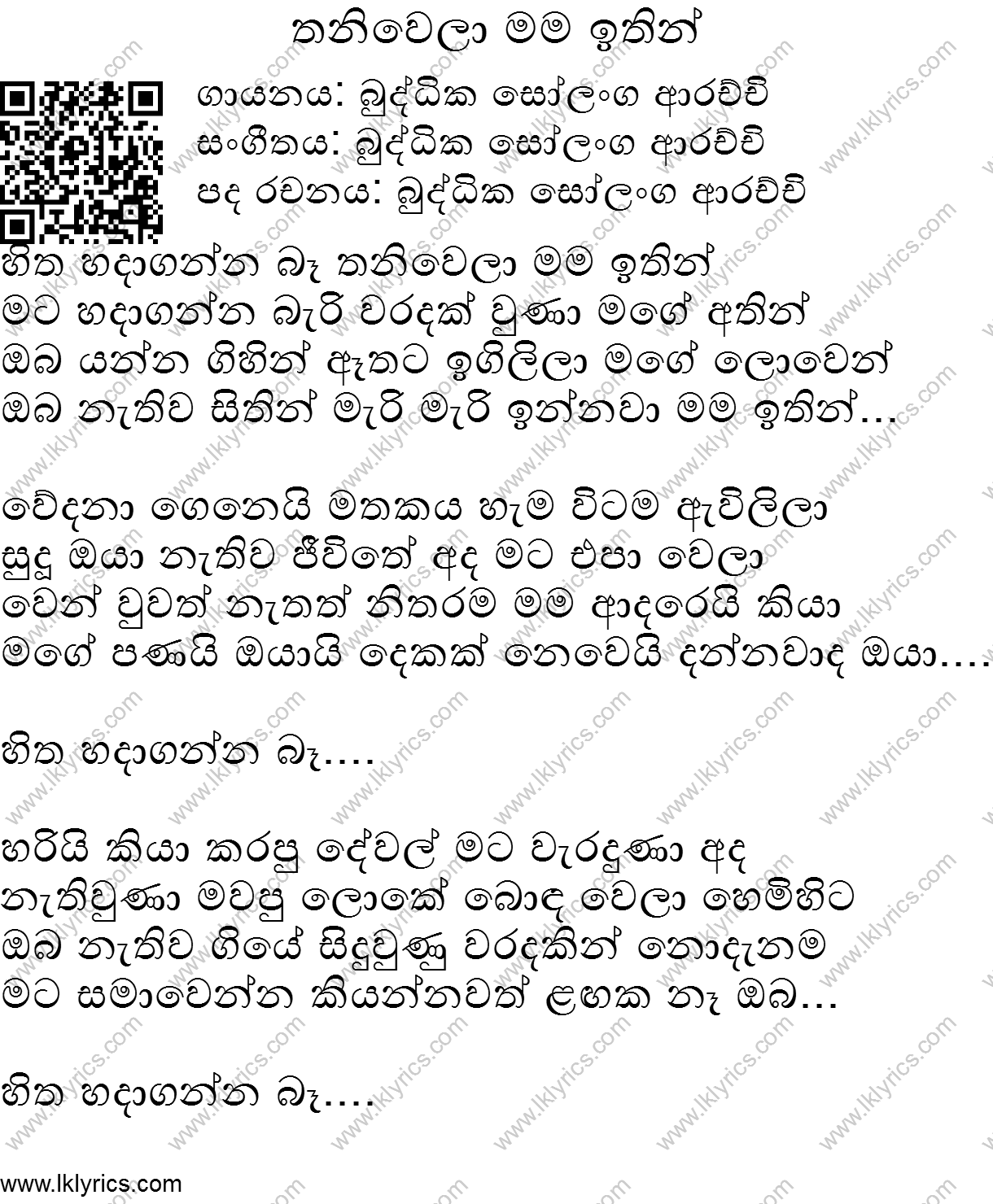 Our records indicate that Thanivela Mama Ithin is sung by Buddhika Solanga Arachchi, . The lyricist of this song is Buddhika Solanga Arachchi. The composer of this song is Buddhika Solanga Arachchi. Thanivela Mama Ithin's first published year is unknown. We would like to invite you to submit it if you are aware. You can listen to this song by visiting the following youtube link: https://www.youtube.com/watch?v=GKgkmMdmNso. Lk Lyrics is largely a community maintained application. Please feel free to use our android app or web site to submit corrections to this song.