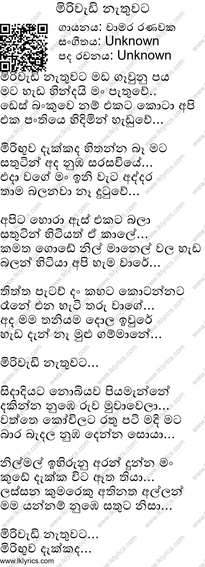 Miriwadi Nathuwata on LK Lyrics falls under and fully comply with 17 U.S.C. * 512 and the Digital Millennium Copyright Act (DMCA). As the Lk Lyrics team, we believe content ownership and intellectual property. If you're the copyright owner of this song and you wish to take this lyric material removed, you can do so by officially submitting a take down notice with the information on this page to info@lklyrics.com. However, we would like to stress that Miriwadi Nathuwata is displayed for informational purposes and Lk Lyrics is in no way claiming rights to this song.