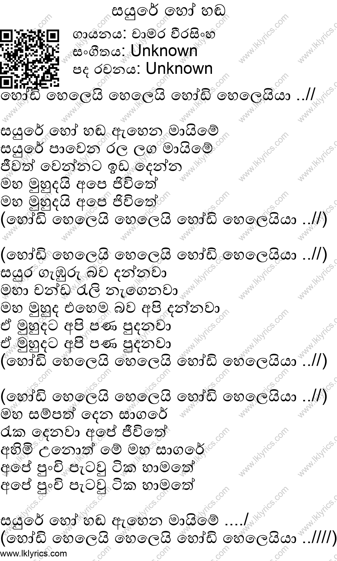 Our records indicate that Sayure Ho Handa is sung by Chamara Weerasinghe, . The lyricist of this song is currently unknown. The composer of this song is currently unknown. Sayure Ho Handa's first published year is unknown. We would like to invite you to submit it if you are aware. We currently do not have a youtube link to this song. We appreciate if you can submit one. Lk Lyrics is largely a community maintained application. Please feel free to use our android app or web site to submit corrections to this song.