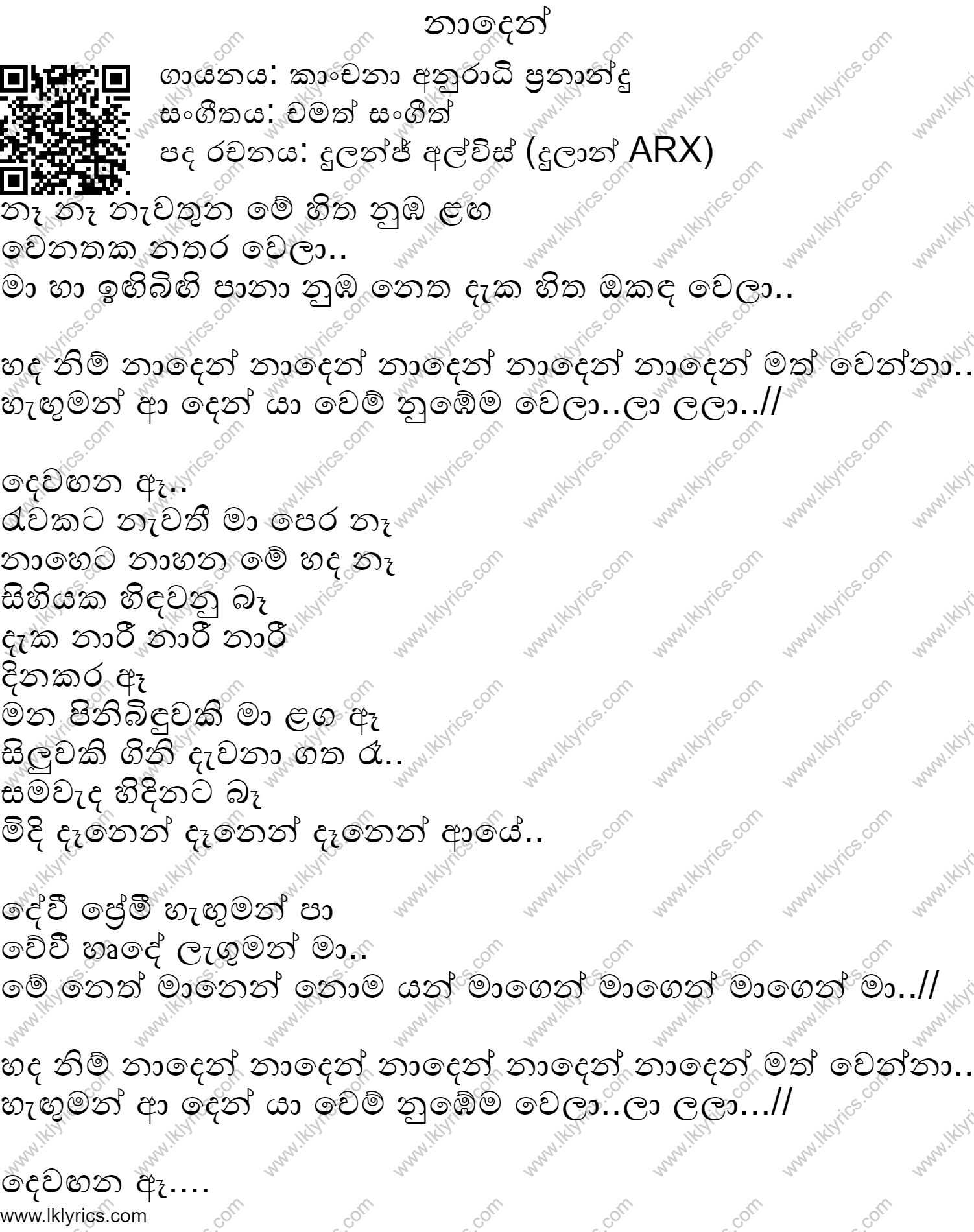 Our records indicate that Naden is sung by Kanchana Anuradhi Fernando, . The lyricist of this song is Dulanja Alwis (Dulan ARX). The composer of this song is Chamath Sangeeth. Naden was first published in 2022. You can listen to this song by visiting the following youtube link: https://www.youtube.com/watch?v=ot50HxhJmgQ. Lk Lyrics is largely a community maintained application. Please feel free to use our android app or web site to submit corrections to this song.