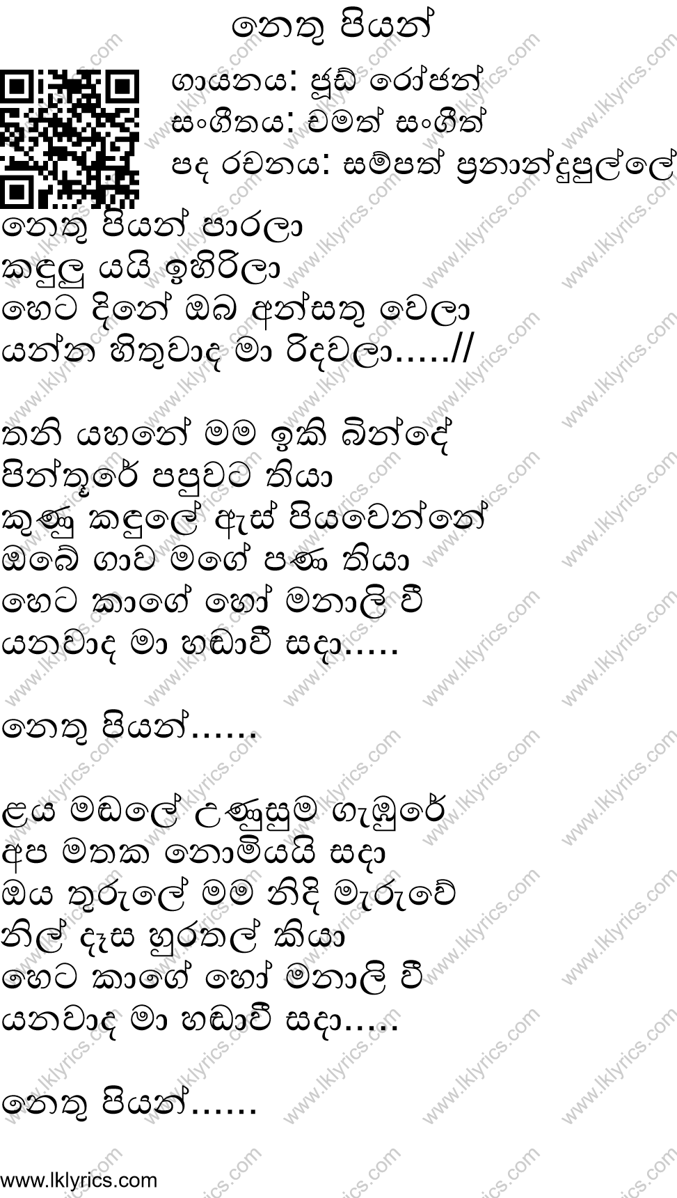 Nethu Piyan on LK Lyrics falls under and fully comply with 17 U.S.C. * 512 and the Digital Millennium Copyright Act (DMCA). As the Lk Lyrics team, we believe content ownership and intellectual property. If you're the copyright owner of this song and you wish to take this lyric material removed, you can do so by officially submitting a take down notice with the information on this page to info@lklyrics.com. However, we would like to stress that Nethu Piyan is displayed for informational purposes and Lk Lyrics is in no way claiming rights to this song.