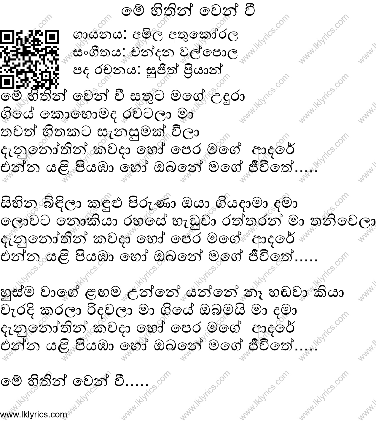 Our records indicate that Me Hithin Wenwee is sung by Amila Athukorala, . The lyricist of this song is Sujith Priyan. The composer of this song is Chandana Walpola. Me Hithin Wenwee's first published year is unknown. We would like to invite you to submit it if you are aware. You can listen to this song by visiting the following youtube link: https://www.youtube.com/watch?v=DQNvkgGLZlY. Lk Lyrics is largely a community maintained application. Please feel free to use our android app or web site to submit corrections to this song.