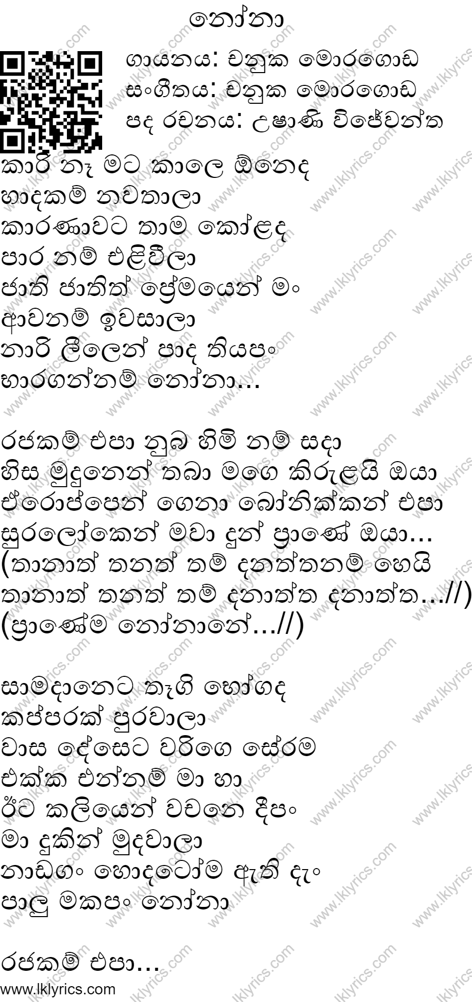 Our records indicate that Nona is sung by Chanuka Moragoda, . The lyricist of this song is Ushani Wijewantha. The composer of this song is Chanuka Moragoda. Nona's first published year is unknown. We would like to invite you to submit it if you are aware. You can listen to this song by visiting the following youtube link: https://youtu.be/qWN3z65wMvk. Lk Lyrics is largely a community maintained application. Please feel free to use our android app or web site to submit corrections to this song.