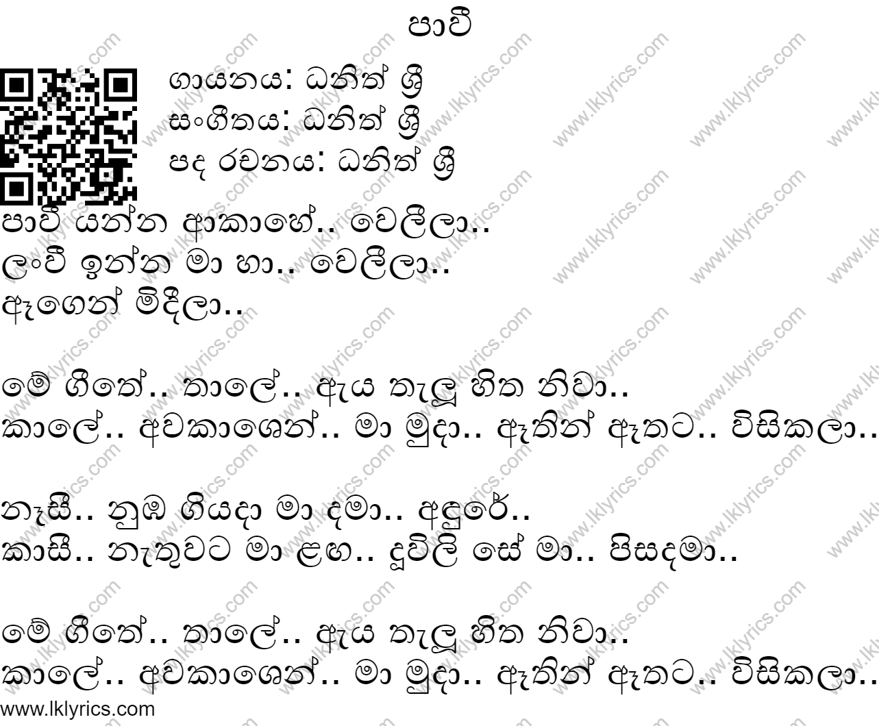 Our records indicate that Pawee is sung by Dhanith Sri, . The lyricist of this song is Dhanith Sri. The composer of this song is Dhanith Sri. Pawee was first published in 2021. You can listen to this song by visiting the following youtube link: https://www.youtube.com/watch?v=QfrOorA5BjY. Lk Lyrics is largely a community maintained application. Please feel free to use our android app or web site to submit corrections to this song.