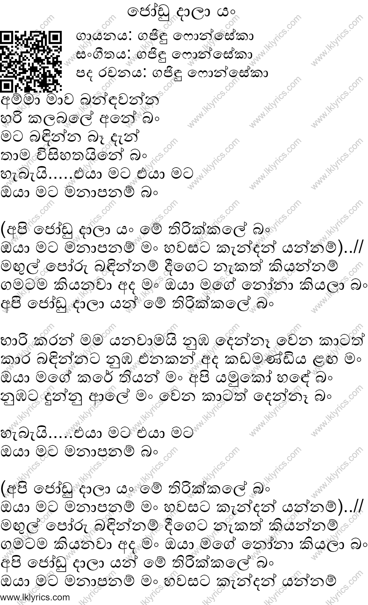 Our records indicate that Joodu Dala Yan is sung by Gajindu Fonseka, . The lyricist of this song is Gajindu Fonseka. The composer of this song is Gajindu Fonseka. Joodu Dala Yan was first published in 2025. You can listen to this song by visiting the following youtube link: https://www.youtube.com/watch?v=PxPIJye1UXM&list=RDPxPIJye1UXM&start_radio=1. Lk Lyrics is largely a community maintained application. Please feel free to use our android app or web site to submit corrections to this song.