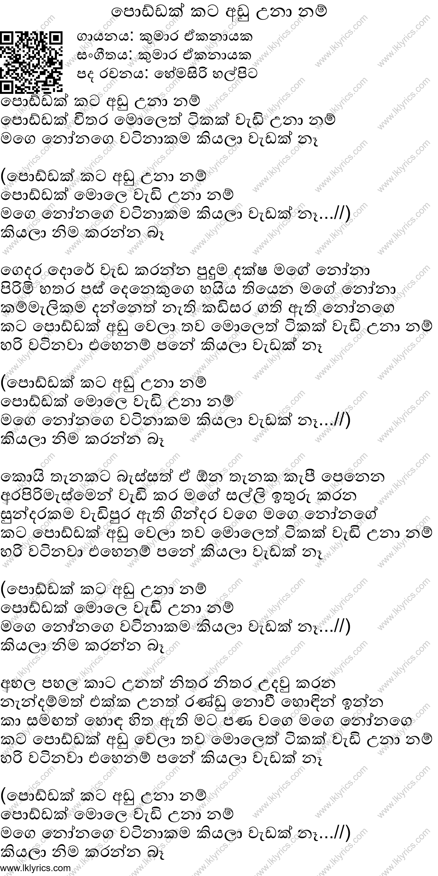 Our records indicate that Poddak Kata Adu Una Nam is sung by Kumara Ekanayake, . The lyricist of this song is Hemasiri Halpita. The composer of this song is Kumara Ekanayake. Poddak Kata Adu Una Nam's first published year is unknown. We would like to invite you to submit it if you are aware. We currently do not have a youtube link to this song. We appreciate if you can submit one. Lk Lyrics is largely a community maintained application. Please feel free to use our android app or web site to submit corrections to this song.