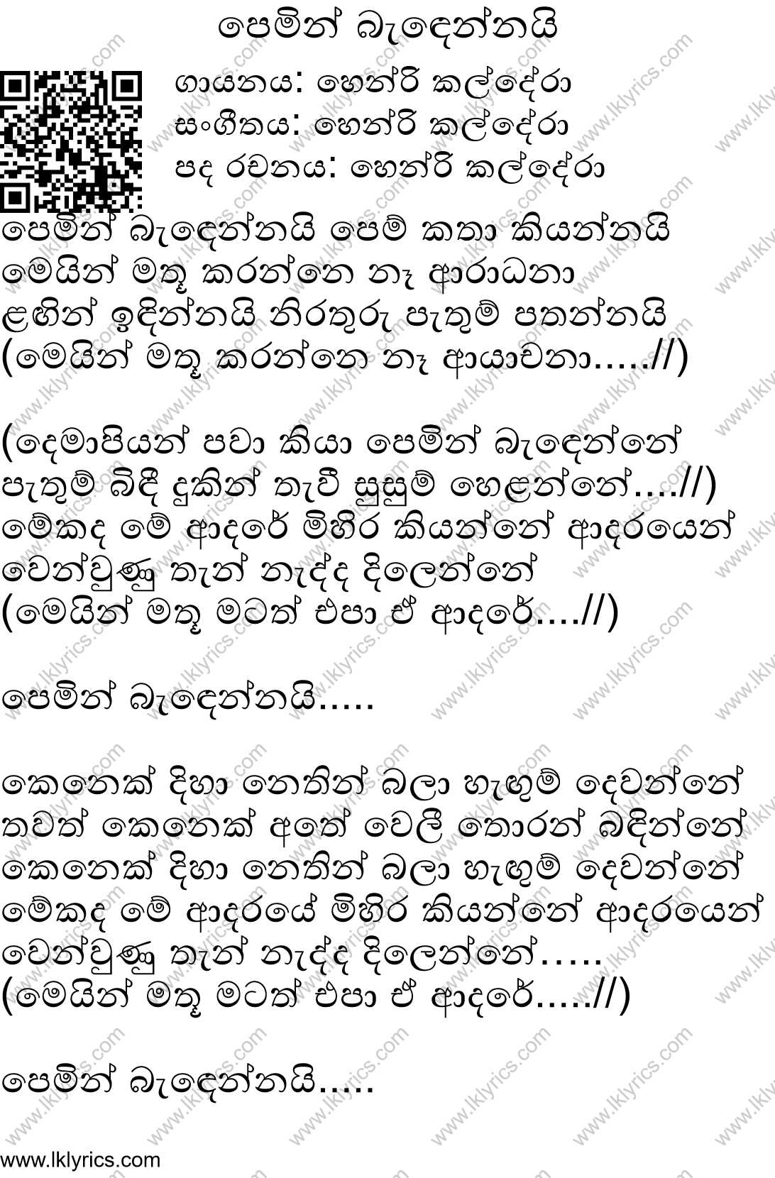Our records indicate that Pemin Bendennai is sung by Henry Kaldera, . The lyricist of this song is Henry Kaldera. The composer of this song is Henry Kaldera. Pemin Bendennai's first published year is unknown. We would like to invite you to submit it if you are aware. We currently do not have a youtube link to this song. We appreciate if you can submit one. Lk Lyrics is largely a community maintained application. Please feel free to use our android app or web site to submit corrections to this song.