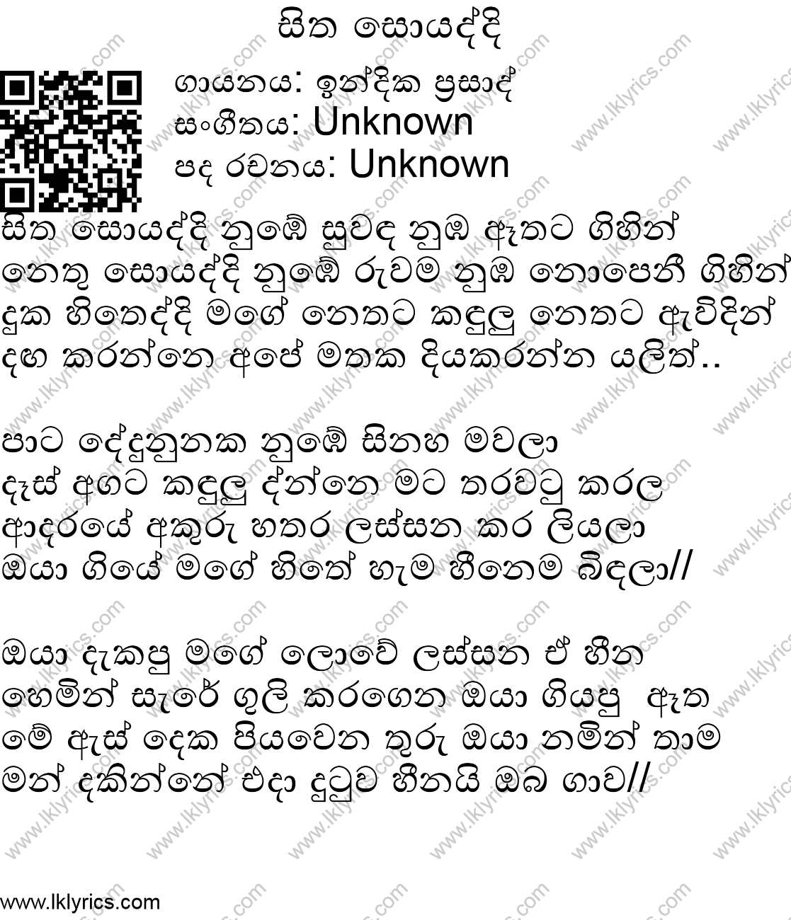 Sitha Soyaddi on LK Lyrics falls under and fully comply with 17 U.S.C. * 512 and the Digital Millennium Copyright Act (DMCA). As the Lk Lyrics team, we believe content ownership and intellectual property. If you're the copyright owner of this song and you wish to take this lyric material removed, you can do so by officially submitting a take down notice with the information on this page to info@lklyrics.com. However, we would like to stress that Sitha Soyaddi is displayed for informational purposes and Lk Lyrics is in no way claiming rights to this song.