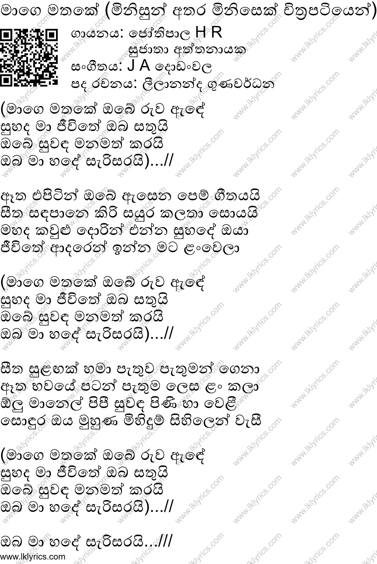 Our records indicate that Mage Mathake is sung by Jothipala H R, Sujatha Aththanayaka, . The lyricist of this song is Leelananda Gunewardane. The composer of this song is J A Dodanwala. Mage Mathake's first published year is unknown. We would like to invite you to submit it if you are aware. You can listen to this song by visiting the following youtube link: https://youtu.be/JwMu9xsCku4. Lk Lyrics is largely a community maintained application. Please feel free to use our android app or web site to submit corrections to this song.
