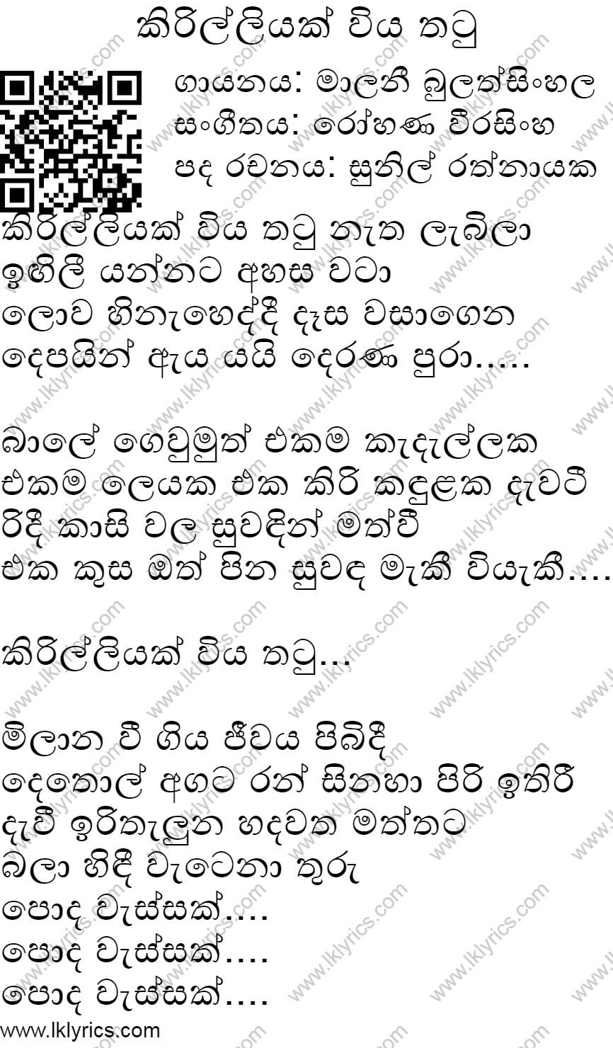 Our records indicate that Kirilliyak Viya Thatu is sung by Malani Bulathsinhala, . The lyricist of this song is Sunil Rathnayake. The composer of this song is Rohana Weerasinghe. Kirilliyak Viya Thatu's first published year is unknown. We would like to invite you to submit it if you are aware. You can listen to this song by visiting the following youtube link: https://youtu.be/79l_xCmBeGA. Lk Lyrics is largely a community maintained application. Please feel free to use our android app or web site to submit corrections to this song.