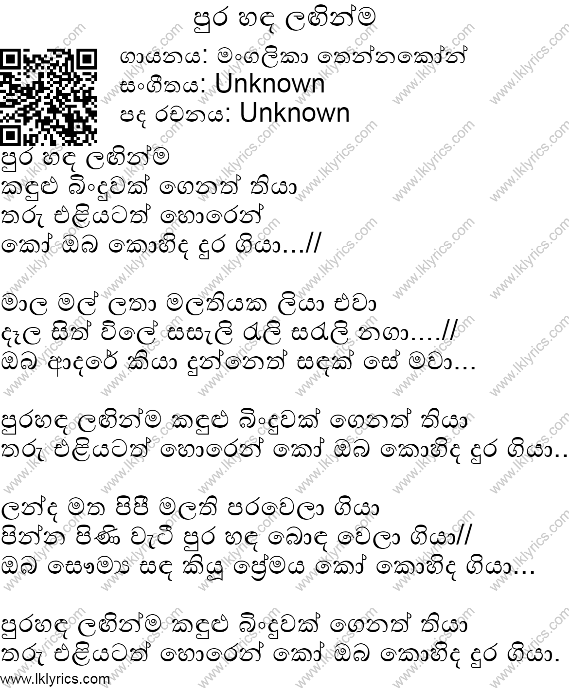 Our records indicate that Pura Handa Langinma is sung by Mangalika Thennakoon, . The lyricist of this song is currently unknown. The composer of this song is currently unknown. Pura Handa Langinma's first published year is unknown. We would like to invite you to submit it if you are aware. You can listen to this song by visiting the following youtube link: https://www.youtube.com/watch?v=gEZgVrMC-Ss. Lk Lyrics is largely a community maintained application. Please feel free to use our android app or web site to submit corrections to this song.