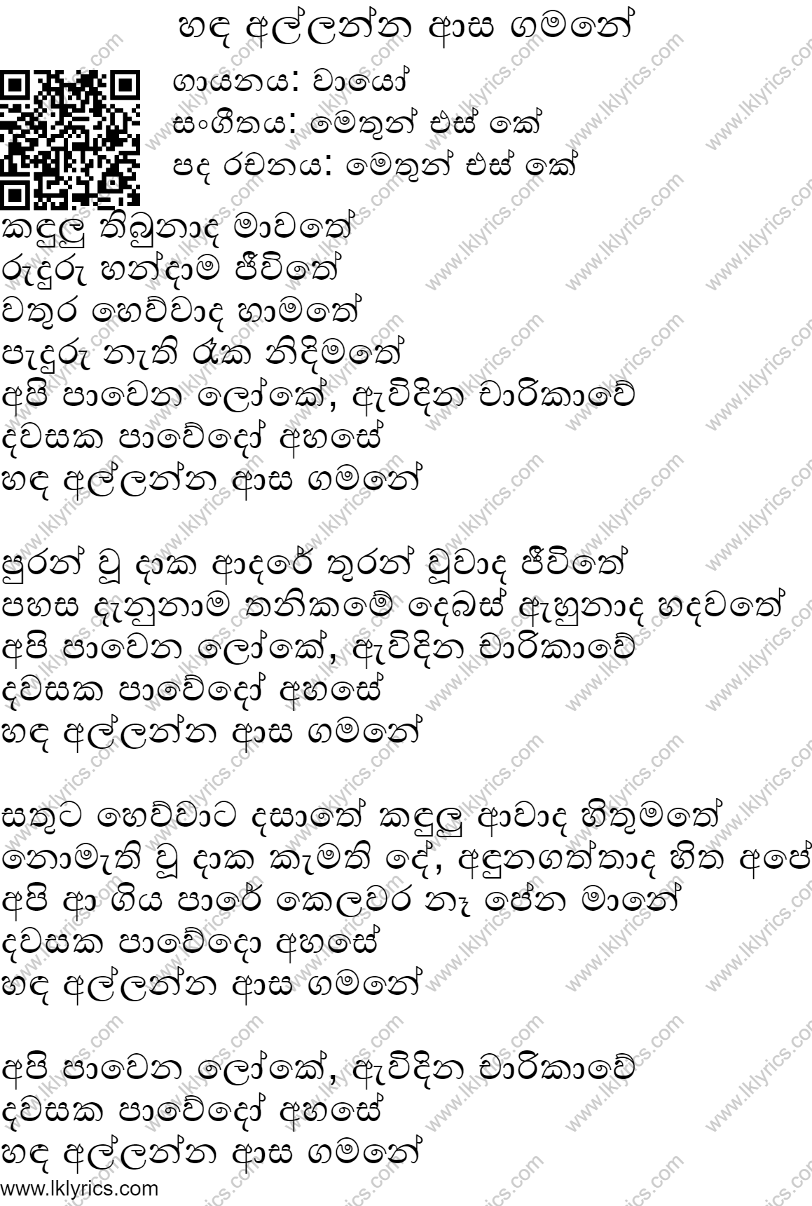 Our records indicate that Handa Allanna Aasa Gamane is sung by Wayo, . The lyricist of this song is Methun SK. The composer of this song is Methun SK. Handa Allanna Aasa Gamane was first published in 2020. You can listen to this song by visiting the following youtube link: https://www.youtube.com/watch?v=cSgpAe9tl3Y. Lk Lyrics is largely a community maintained application. Please feel free to use our android app or web site to submit corrections to this song.