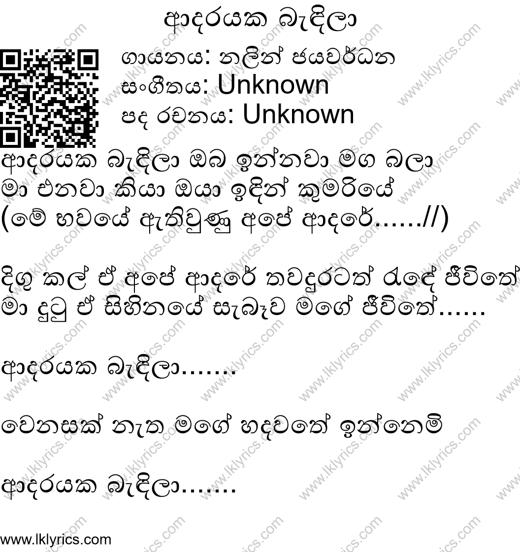 Our records indicate that Adarayaka Bandila is sung by Nalin Jayawardena, . The lyricist of this song is currently unknown. The composer of this song is currently unknown. Adarayaka Bandila's first published year is unknown. We would like to invite you to submit it if you are aware. We currently do not have a youtube link to this song. We appreciate if you can submit one. Lk Lyrics is largely a community maintained application. Please feel free to use our android app or web site to submit corrections to this song.