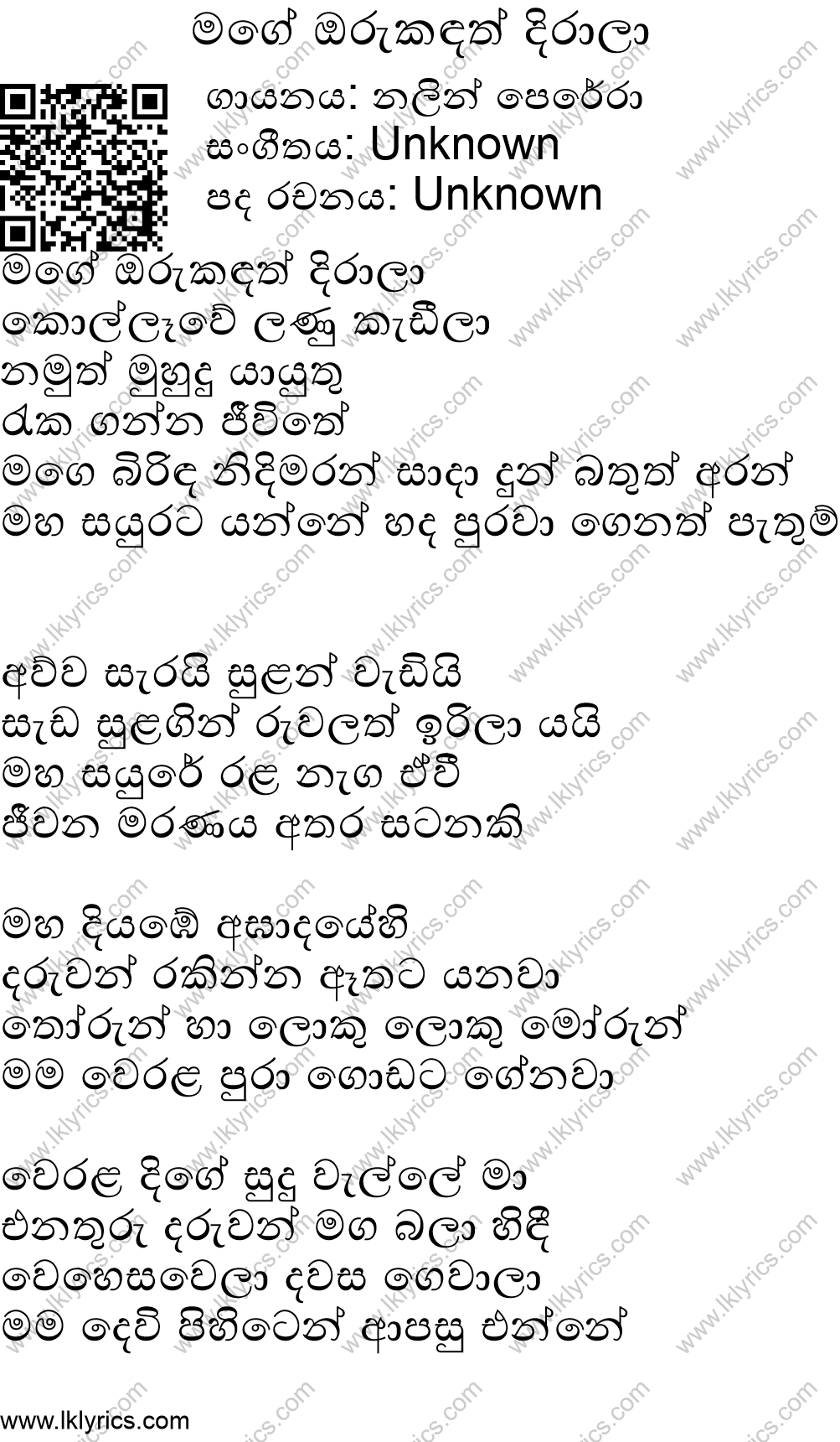Our records indicate that Mage Oru Kandath Dirala is sung by Nalin Perera, . The lyricist of this song is currently unknown. The composer of this song is currently unknown. Mage Oru Kandath Dirala's first published year is unknown. We would like to invite you to submit it if you are aware. We currently do not have a youtube link to this song. We appreciate if you can submit one. Lk Lyrics is largely a community maintained application. Please feel free to use our android app or web site to submit corrections to this song.