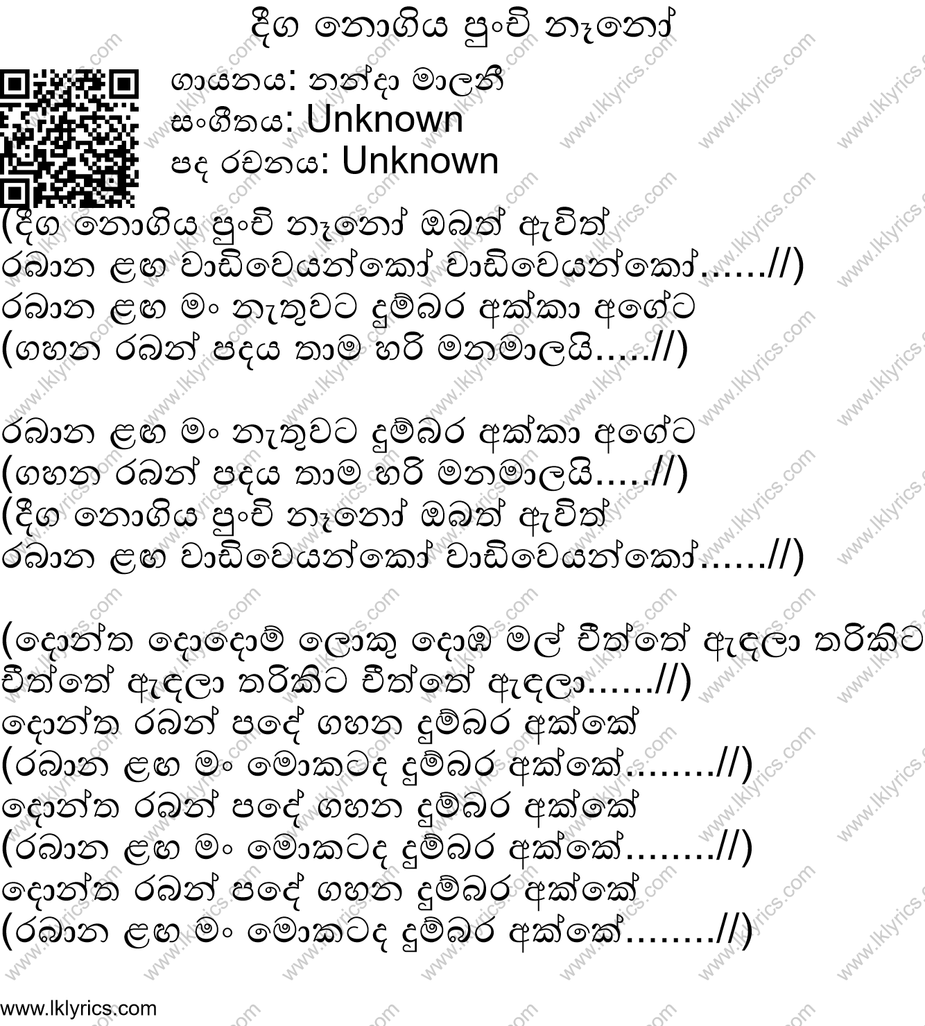 Our records indicate that Deega Nogiya Punchi Nano is sung by Nanda Malani, . The lyricist of this song is currently unknown. The composer of this song is currently unknown. Deega Nogiya Punchi Nano's first published year is unknown. We would like to invite you to submit it if you are aware. You can listen to this song by visiting the following youtube link: https://www.youtube.com/watch?v=WQLfO4dxdRI. Lk Lyrics is largely a community maintained application. Please feel free to use our android app or web site to submit corrections to this song.