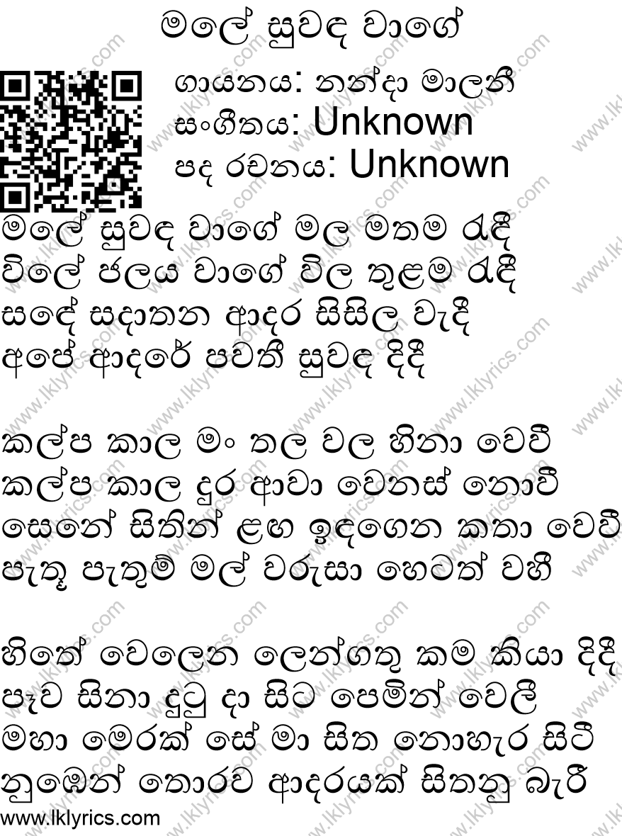 Our records indicate that Male Suwanda Wage is sung by Nanda Malani, . The lyricist of this song is currently unknown. The composer of this song is currently unknown. Male Suwanda Wage's first published year is unknown. We would like to invite you to submit it if you are aware. We currently do not have a youtube link to this song. We appreciate if you can submit one. Lk Lyrics is largely a community maintained application. Please feel free to use our android app or web site to submit corrections to this song.