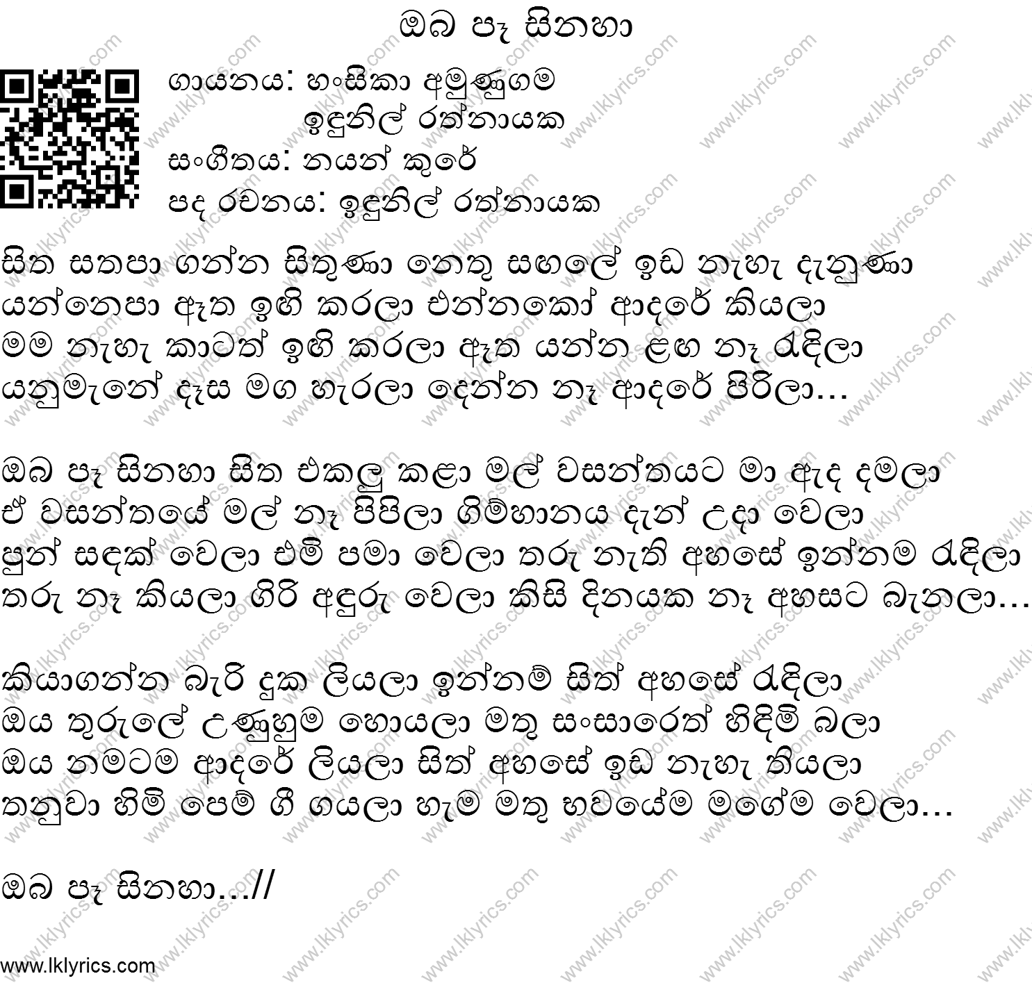 Our records indicate that Oba Paa Sinaha is sung by Indunil Rathnayaka, Hansika Amunugama, . The lyricist of this song is Indunil Rathnayaka. The composer of this song is Nayan Cooray. Oba Paa Sinaha's first published year is unknown. We would like to invite you to submit it if you are aware. You can listen to this song by visiting the following youtube link: https://www.youtube.com/watch?v=DEz5QqtBKts. Lk Lyrics is largely a community maintained application. Please feel free to use our android app or web site to submit corrections to this song.