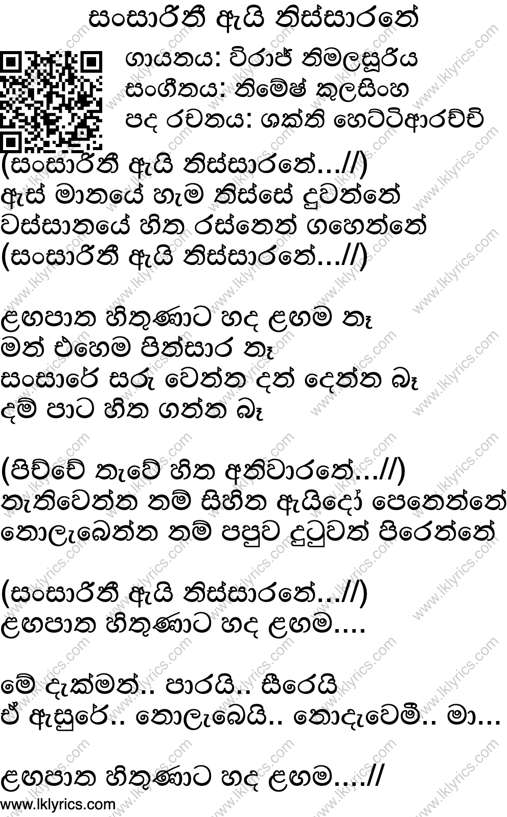 Our records indicate that Sansarini Ai Nissarane is sung by Viraj Nimalasooriya, . The lyricist of this song is Shakthi J Hettiarachchi. The composer of this song is Nimesh Kulasinghe. Sansarini Ai Nissarane was first published in 2019. You can listen to this song by visiting the following youtube link: https://youtu.be/zQp3EJgWEBc. Lk Lyrics is largely a community maintained application. Please feel free to use our android app or web site to submit corrections to this song.