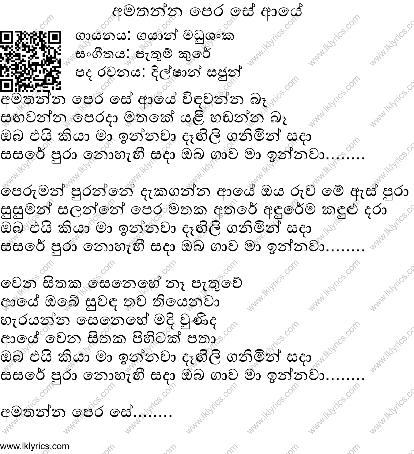 Amathanna Pera Se Aye on LK Lyrics falls under and fully comply with 17 U.S.C. * 512 and the Digital Millennium Copyright Act (DMCA). As the Lk Lyrics team, we believe content ownership and intellectual property. If you're the copyright owner of this song and you wish to take this lyric material removed, you can do so by officially submitting a take down notice with the information on this page to info@lklyrics.com. However, we would like to stress that Amathanna Pera Se Aye is displayed for informational purposes and Lk Lyrics is in no way claiming rights to this song.