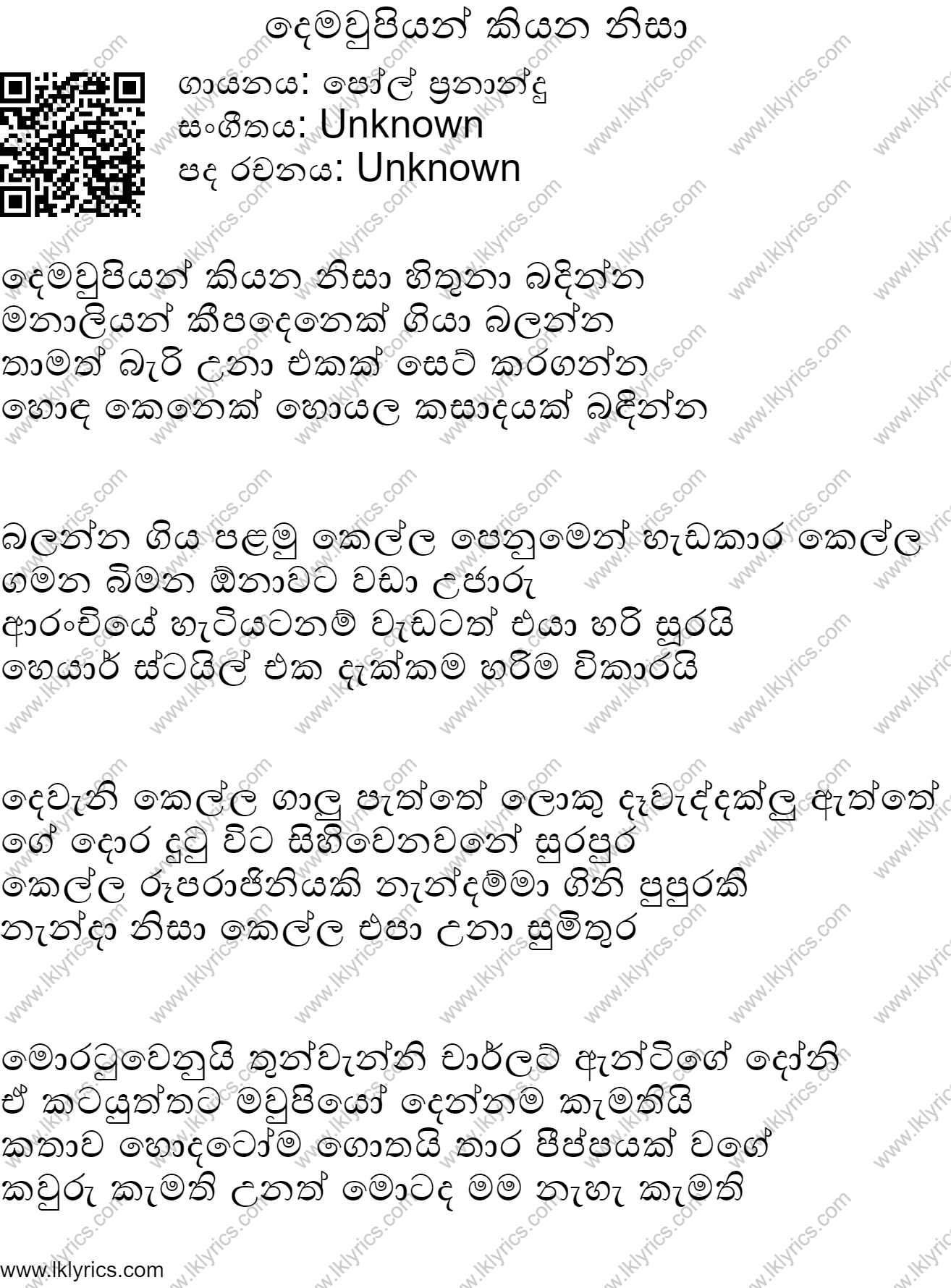 Our records indicate that Demawupiyan Kiyana Nisa is sung by Paul Fernando, . The lyricist of this song is currently unknown. The composer of this song is currently unknown. Demawupiyan Kiyana Nisa's first published year is unknown. We would like to invite you to submit it if you are aware. You can listen to this song by visiting the following youtube link: https://www.youtube.com/watch?v=ei1Z5A9TA2s. Lk Lyrics is largely a community maintained application. Please feel free to use our android app or web site to submit corrections to this song.