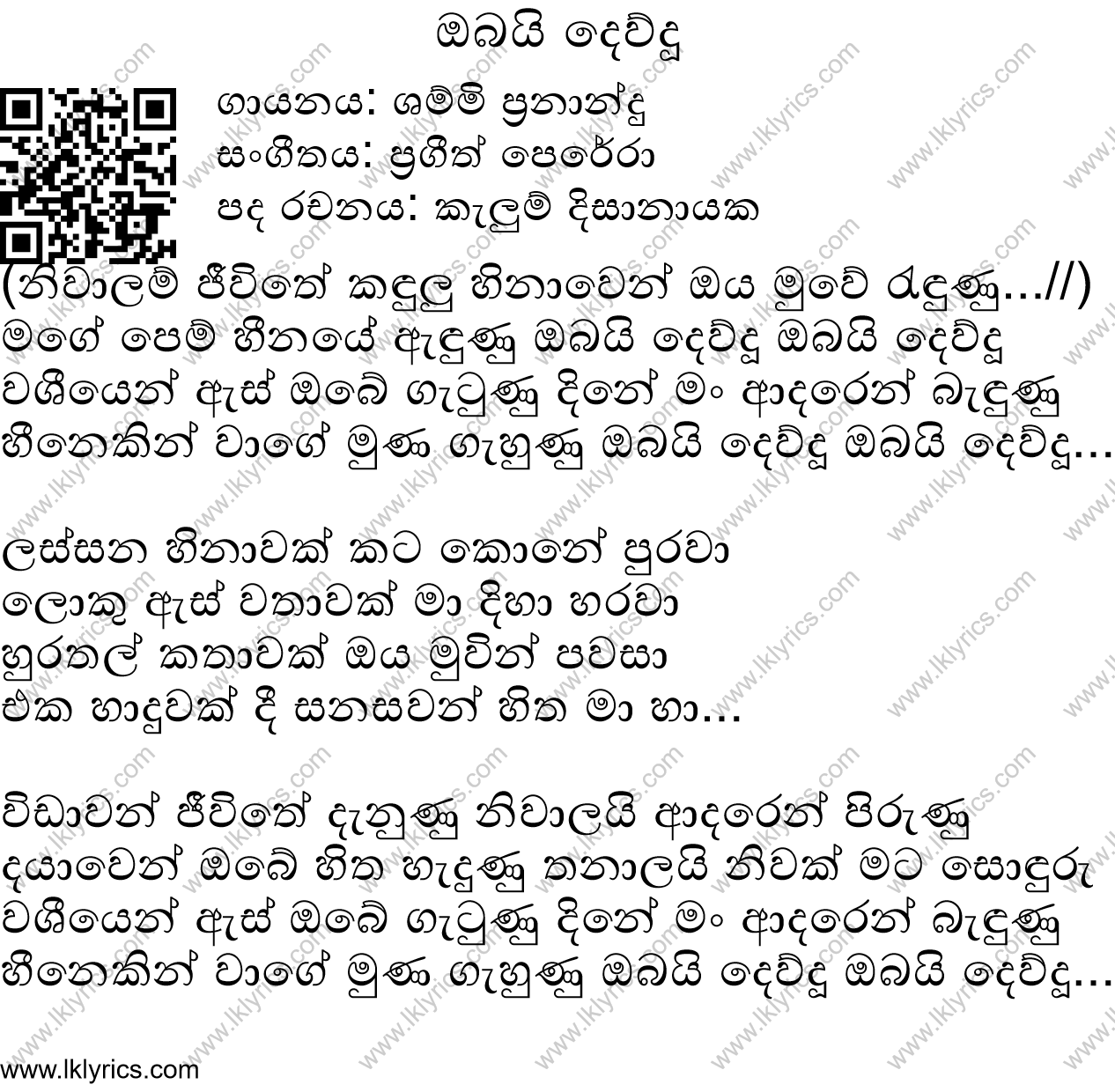 Our records indicate that Obai Devudu is sung by Shammi Fernando, . The lyricist of this song is Kelum Dissanayake. The composer of this song is Prageeth Perera. Obai Devudu's first published year is unknown. We would like to invite you to submit it if you are aware. You can listen to this song by visiting the following youtube link: https://www.google.com/url?sa=t&rct=j&q=&esrc=s&source=web&cd=1&cad=rja&uact=8&ved=2ahUKEwiy8pq_gPHoAhUimuYKHT7bDvAQwqsBMAB6BAgJEAQ&url=https%3A%2F%2Fwww.youtube.com%2Fwatch%3Fv%3DFfVL7M5Dc3g&usg=AOvVaw3KLDvzrhAVuo4rfdIqcCR5. Lk Lyrics is largely a community maintained application. Please feel free to use our android app or web site to submit corrections to this song.