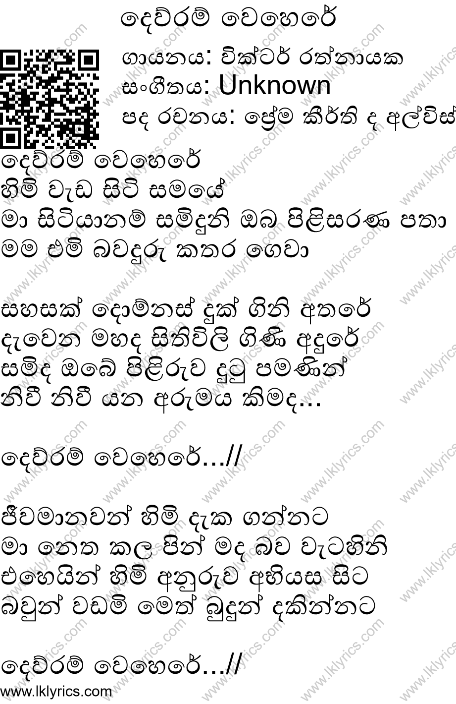 Our records indicate that Dewram Wehere is sung by Victor Rathnayake, . The lyricist of this song is Prema Keerthi De Alwis. The composer of this song is currently unknown. Dewram Wehere's first published year is unknown. We would like to invite you to submit it if you are aware. We currently do not have a youtube link to this song. We appreciate if you can submit one. Lk Lyrics is largely a community maintained application. Please feel free to use our android app or web site to submit corrections to this song.