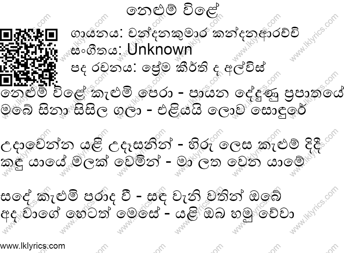 Nelum Wile on LK Lyrics falls under and fully comply with 17 U.S.C. * 512 and the Digital Millennium Copyright Act (DMCA). As the Lk Lyrics team, we believe content ownership and intellectual property. If you're the copyright owner of this song and you wish to take this lyric material removed, you can do so by officially submitting a take down notice with the information on this page to info@lklyrics.com. However, we would like to stress that Nelum Wile is displayed for informational purposes and Lk Lyrics is in no way claiming rights to this song.