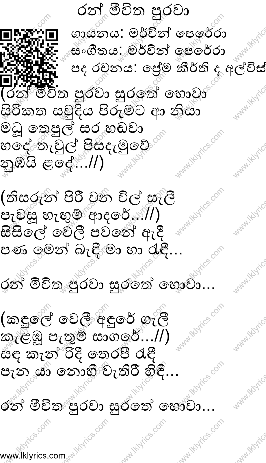 Our records indicate that Ran Meewitha Purawa is sung by Mervin Perera, . The lyricist of this song is Prema Keerthi De Alwis. The composer of this song is Mervin Perera. Ran Meewitha Purawa's first published year is unknown. We would like to invite you to submit it if you are aware. You can listen to this song by visiting the following youtube link: https://youtu.be/e-AYQu9I6wQ. Lk Lyrics is largely a community maintained application. Please feel free to use our android app or web site to submit corrections to this song.