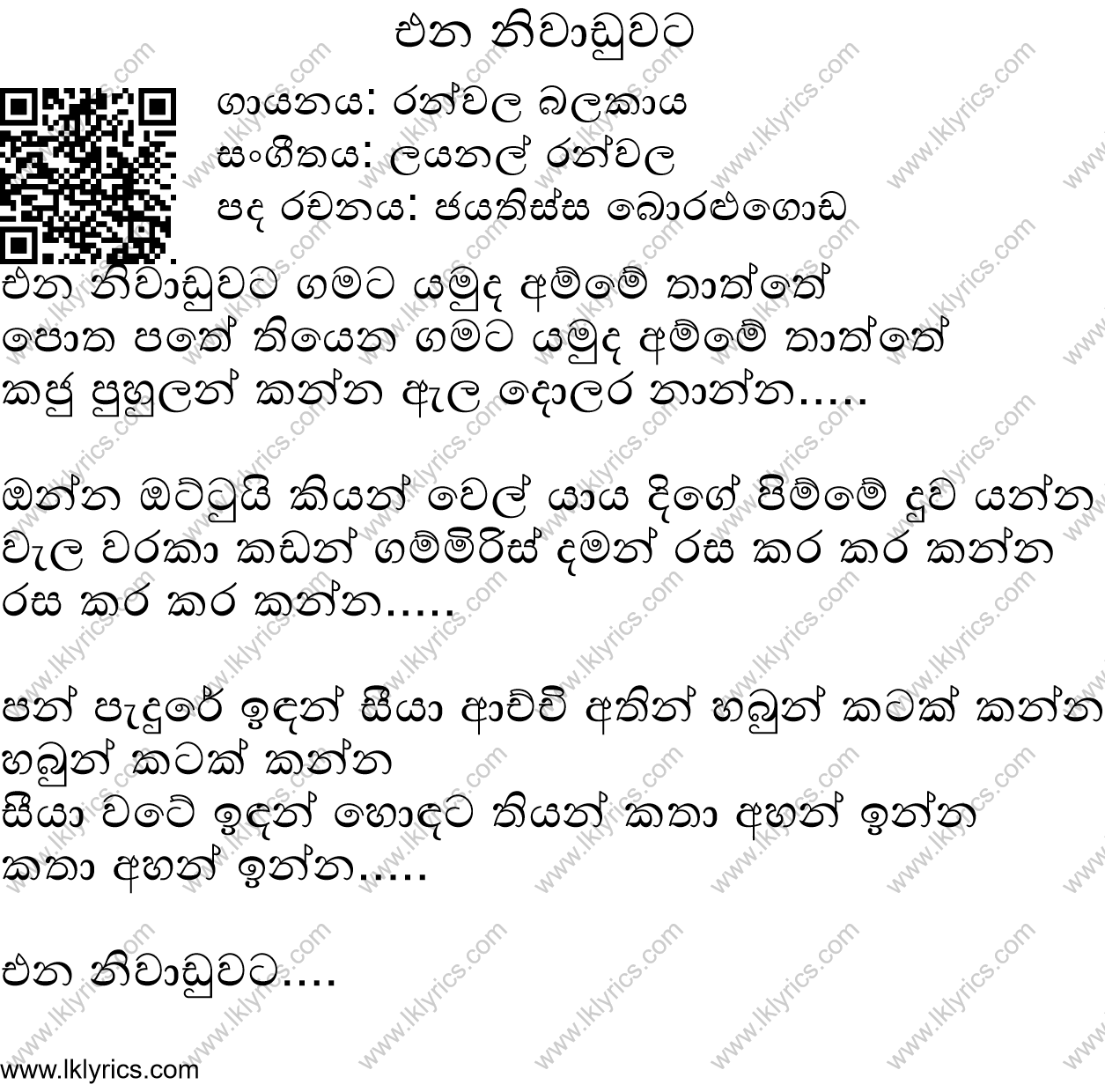 Ena Niwaduwata on LK Lyrics falls under and fully comply with 17 U.S.C. * 512 and the Digital Millennium Copyright Act (DMCA). As the Lk Lyrics team, we believe content ownership and intellectual property. If you're the copyright owner of this song and you wish to take this lyric material removed, you can do so by officially submitting a take down notice with the information on this page to info@lklyrics.com. However, we would like to stress that Ena Niwaduwata is displayed for informational purposes and Lk Lyrics is in no way claiming rights to this song.
