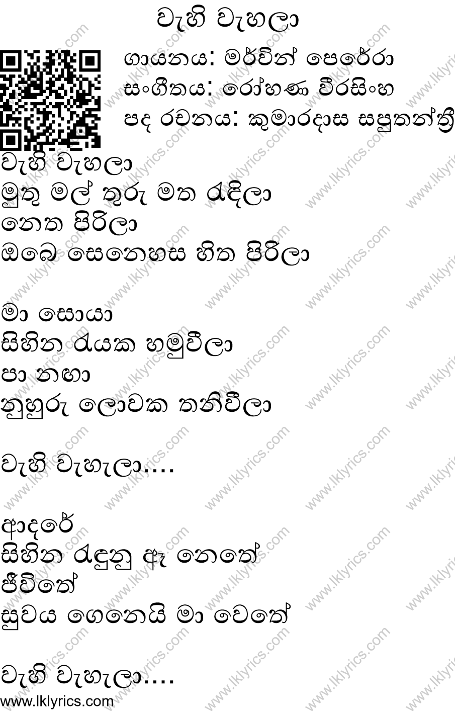 Our records indicate that Wehi Wehala is sung by Mervin Perera, . The lyricist of this song is Kumaradasa Saputhanthri. The composer of this song is Rohana Weerasinghe. Wehi Wehala's first published year is unknown. We would like to invite you to submit it if you are aware. We currently do not have a youtube link to this song. We appreciate if you can submit one. Lk Lyrics is largely a community maintained application. Please feel free to use our android app or web site to submit corrections to this song.