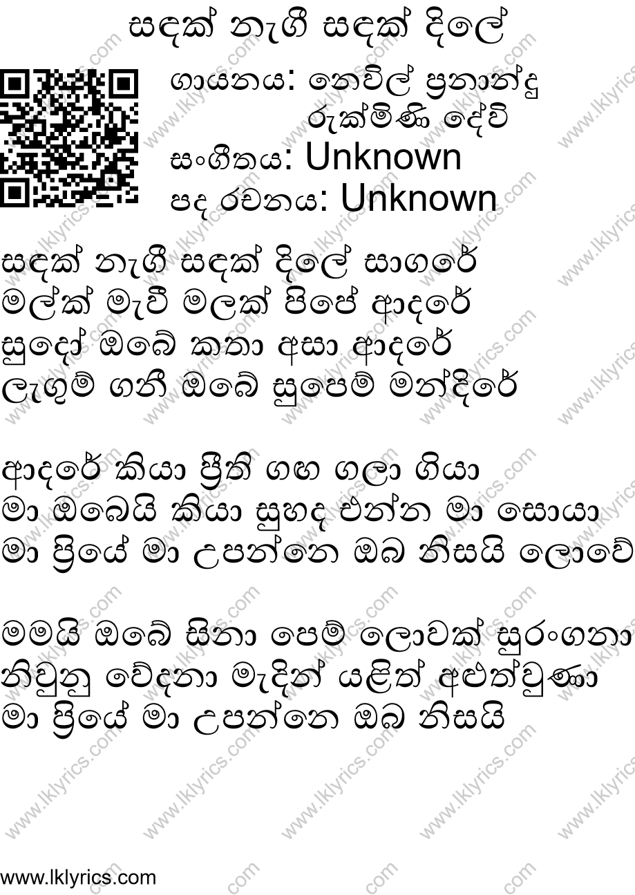 Our records indicate that Sandak Nagi Sandak Dile is sung by Rukmani Devi, Neville fernando, . The lyricist of this song is currently unknown. The composer of this song is currently unknown. Sandak Nagi Sandak Dile's first published year is unknown. We would like to invite you to submit it if you are aware. We currently do not have a youtube link to this song. We appreciate if you can submit one. Lk Lyrics is largely a community maintained application. Please feel free to use our android app or web site to submit corrections to this song.