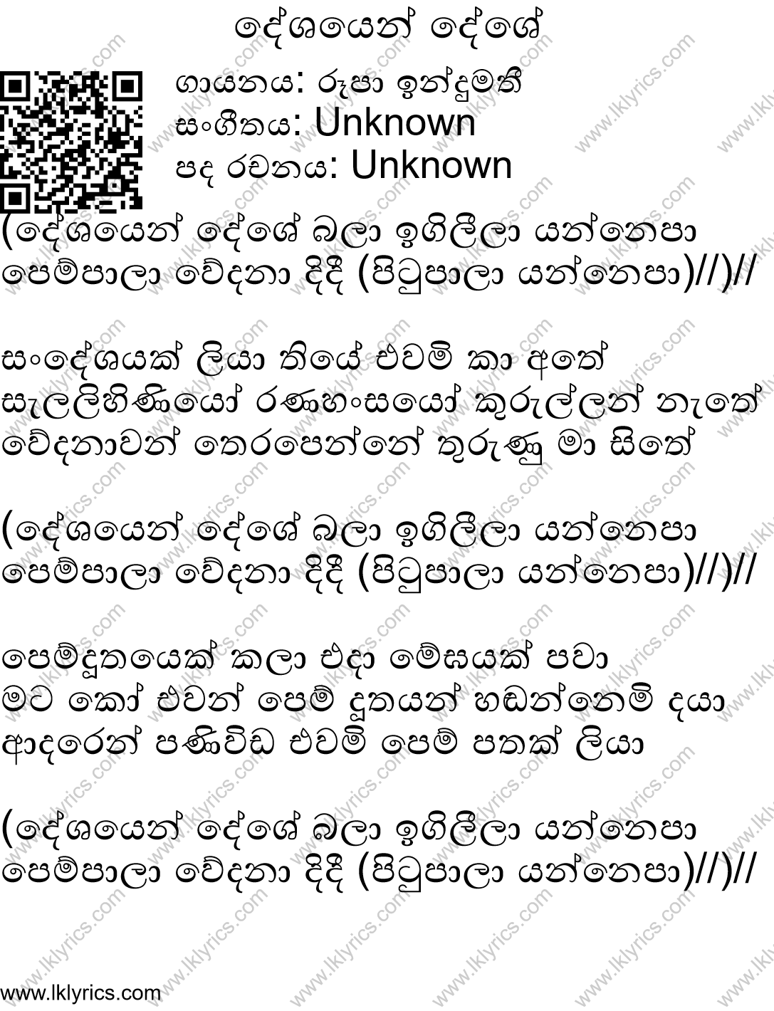 Our records indicate that Deshayen Deshe is sung by Rupa Indumathee, . The lyricist of this song is currently unknown. The composer of this song is currently unknown. Deshayen Deshe's first published year is unknown. We would like to invite you to submit it if you are aware. We currently do not have a youtube link to this song. We appreciate if you can submit one. Lk Lyrics is largely a community maintained application. Please feel free to use our android app or web site to submit corrections to this song.