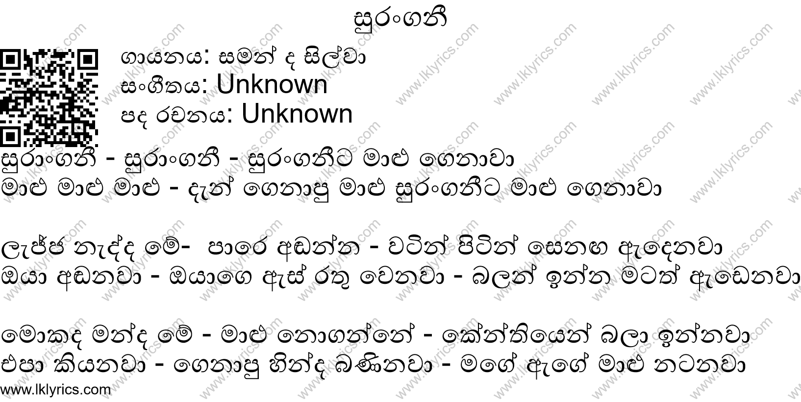 Our records indicate that Surangani is sung by Saman De Silva, . The lyricist of this song is currently unknown. The composer of this song is currently unknown. Surangani's first published year is unknown. We would like to invite you to submit it if you are aware. We currently do not have a youtube link to this song. We appreciate if you can submit one. Lk Lyrics is largely a community maintained application. Please feel free to use our android app or web site to submit corrections to this song.