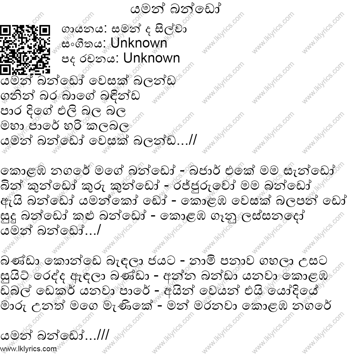 Our records indicate that Yaman Bando is sung by Saman De Silva, . The lyricist of this song is currently unknown. The composer of this song is currently unknown. Yaman Bando's first published year is unknown. We would like to invite you to submit it if you are aware. You can listen to this song by visiting the following youtube link: https://www.youtube.com/watch?v=qMaO88RImeA. Lk Lyrics is largely a community maintained application. Please feel free to use our android app or web site to submit corrections to this song.