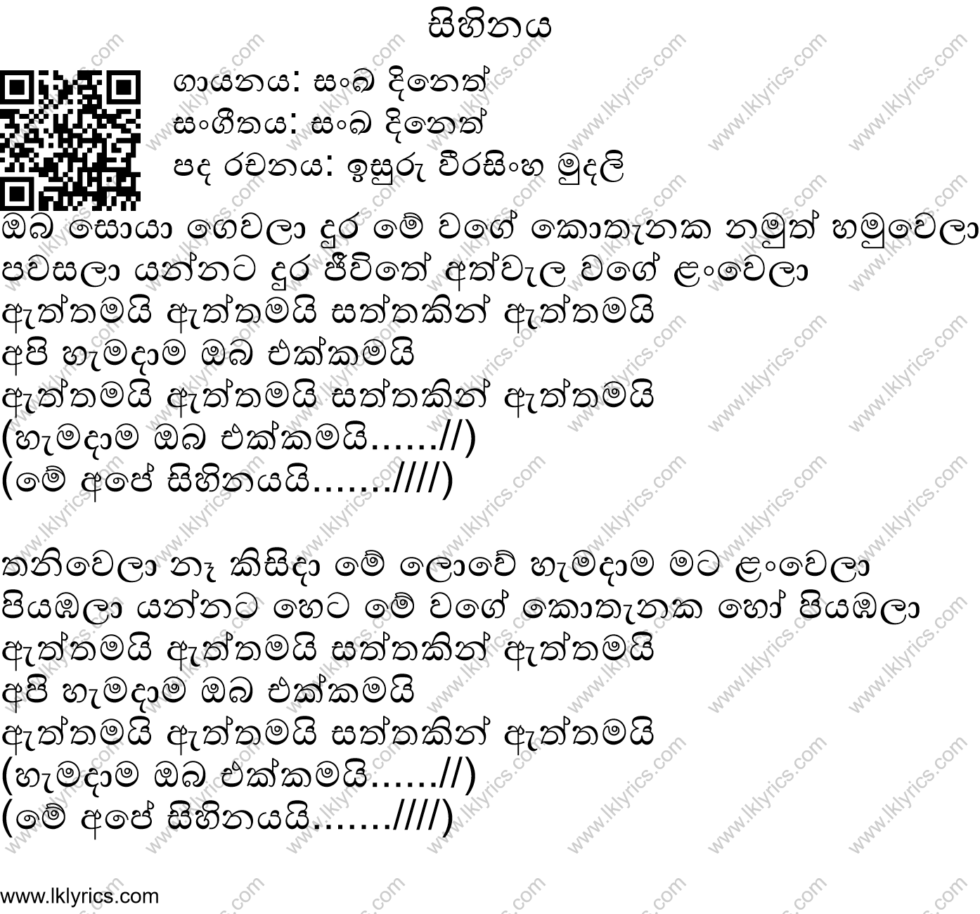 Sihinaya on LK Lyrics falls under and fully comply with 17 U.S.C. * 512 and the Digital Millennium Copyright Act (DMCA). As the Lk Lyrics team, we believe content ownership and intellectual property. If you're the copyright owner of this song and you wish to take this lyric material removed, you can do so by officially submitting a take down notice with the information on this page to info@lklyrics.com. However, we would like to stress that Sihinaya is displayed for informational purposes and Lk Lyrics is in no way claiming rights to this song.