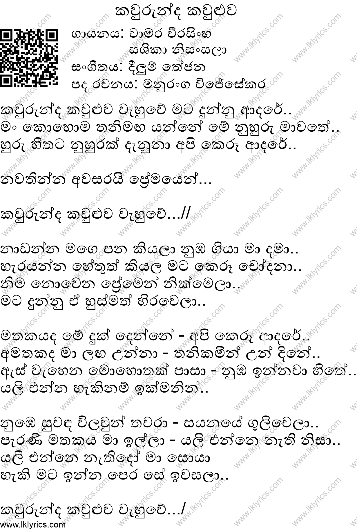 Our records indicate that Kawurunda Kawuluwa is sung by Chamara Weerasinghe, Sashika Nisansala, . The lyricist of this song is Manuranga Wijesekara. The composer of this song is Dilum Thejana. Kawurunda Kawuluwa was first published in 2014. You can listen to this song by visiting the following youtube link: https://www.youtube.com/watch?v=7yBhHRfWXio. Lk Lyrics is largely a community maintained application. Please feel free to use our android app or web site to submit corrections to this song.