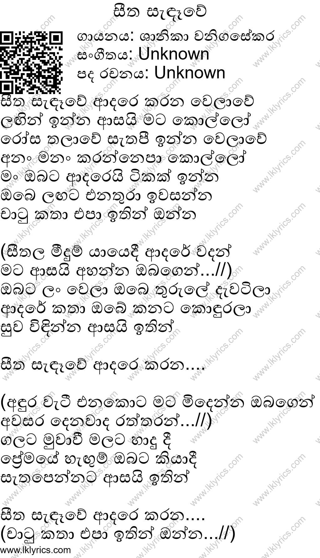 Our records indicate that Seetha Sandawe is sung by Shanika Wanigasekara, . The lyricist of this song is currently unknown. The composer of this song is currently unknown. Seetha Sandawe's first published year is unknown. We would like to invite you to submit it if you are aware. We currently do not have a youtube link to this song. We appreciate if you can submit one. Lk Lyrics is largely a community maintained application. Please feel free to use our android app or web site to submit corrections to this song.