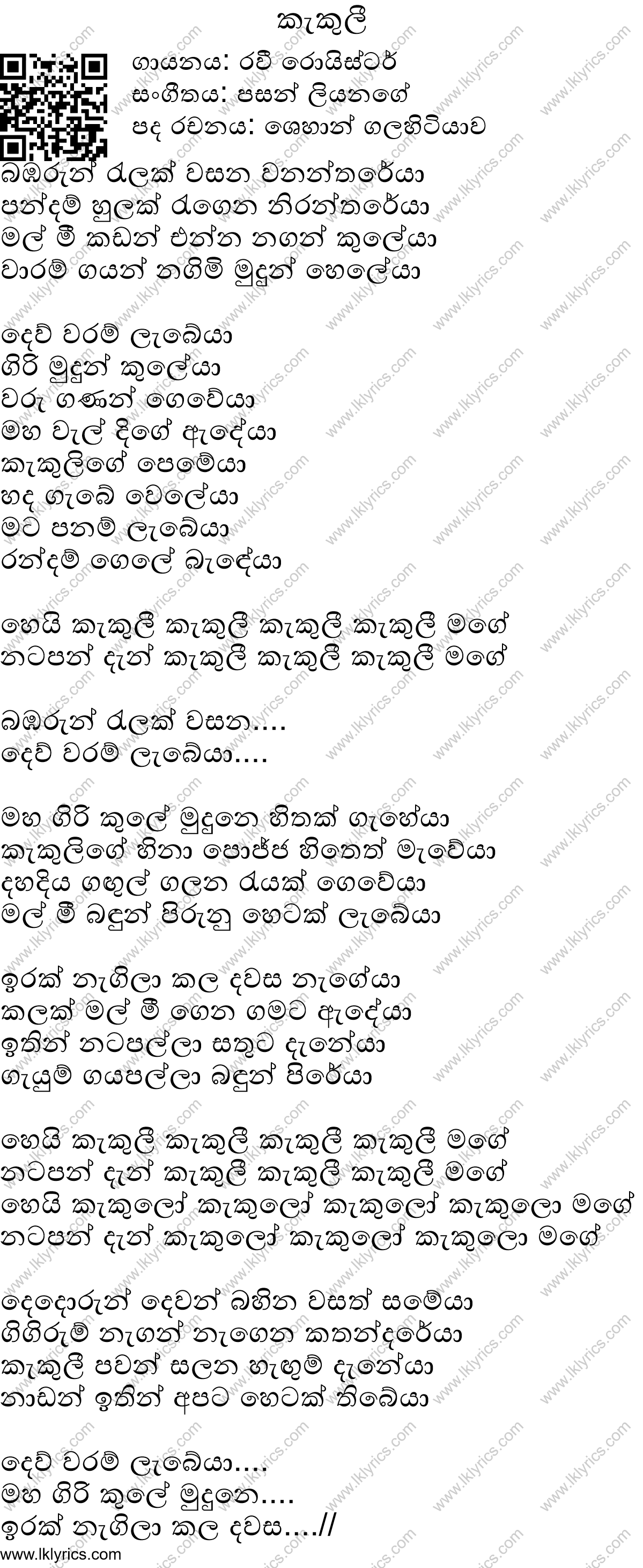 Our records indicate that Hey Kakuli is sung by Ravi Royster, . The lyricist of this song is Shehan Galahitiyawa. The composer of this song is Pasan Liyanage. Hey Kakuli's first published year is unknown. We would like to invite you to submit it if you are aware. You can listen to this song by visiting the following youtube link: https://www.youtube.com/watch?v=8JDgkyacTZ0. Lk Lyrics is largely a community maintained application. Please feel free to use our android app or web site to submit corrections to this song.