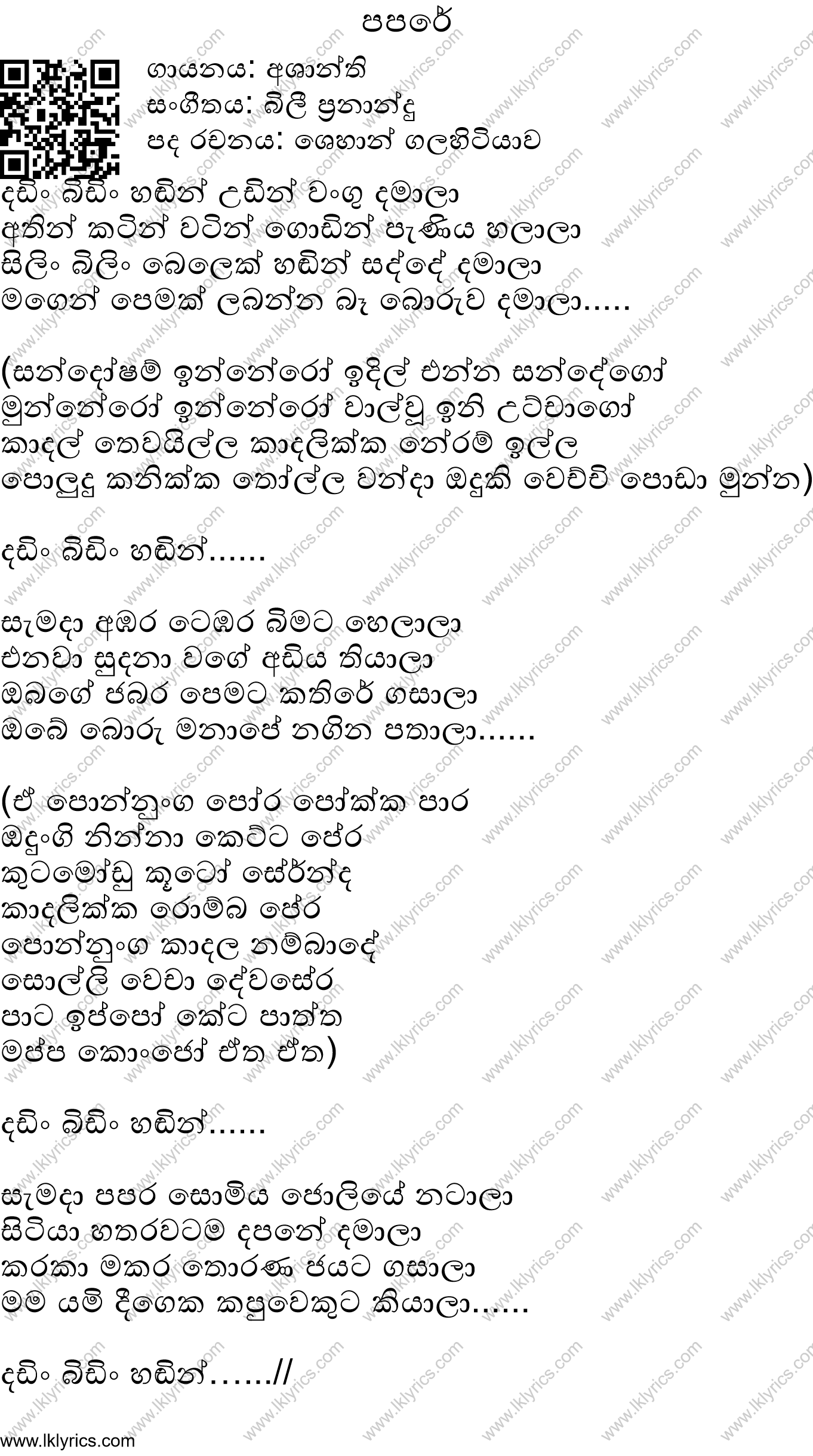 Our records indicate that Papare is sung by Ashanthi, . The lyricist of this song is Shehan Galahitiyawa. The composer of this song is Billy Fernando. Papare was first published in 2012. You can listen to this song by visiting the following youtube link: https://www.youtube.com/watch?v=Wxsbik6MLhQ. Lk Lyrics is largely a community maintained application. Please feel free to use our android app or web site to submit corrections to this song.
